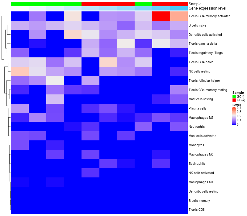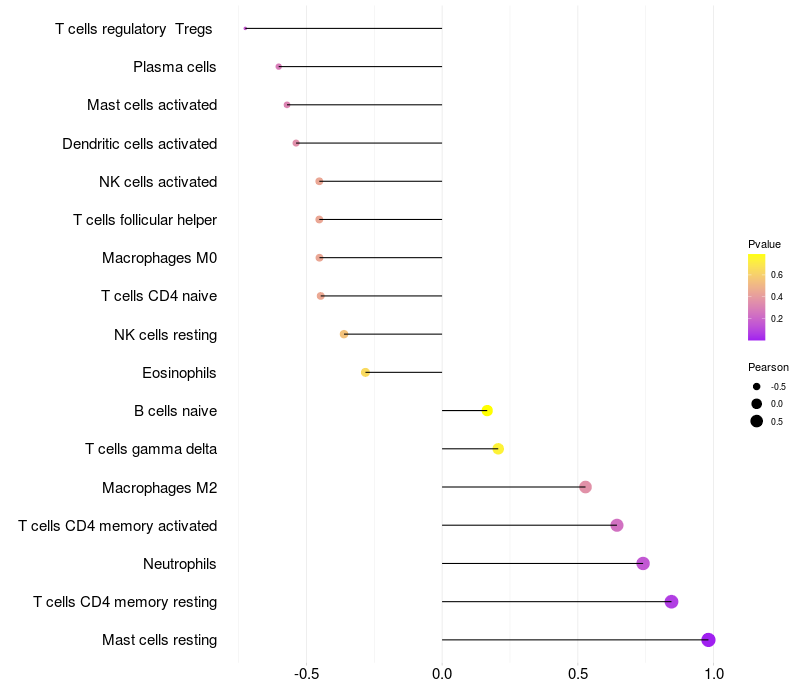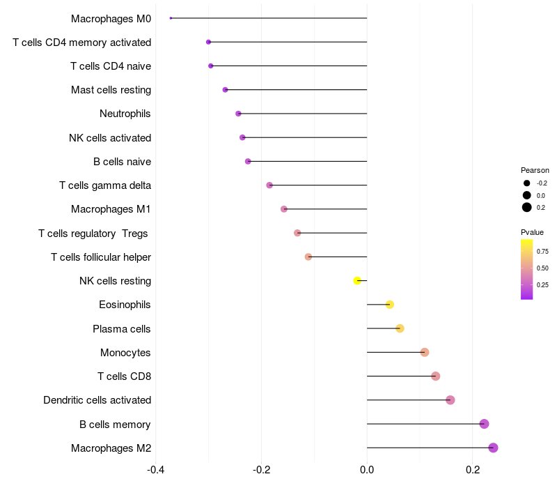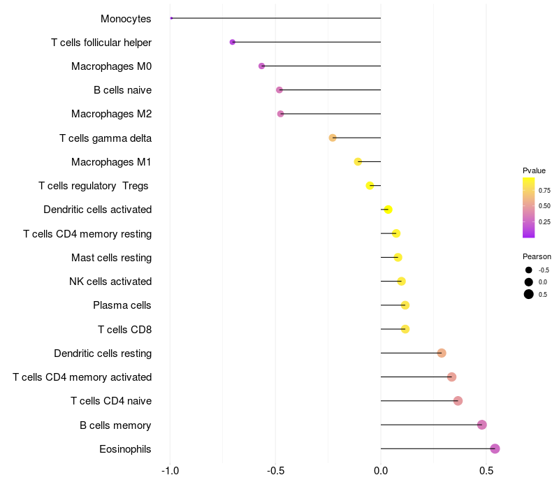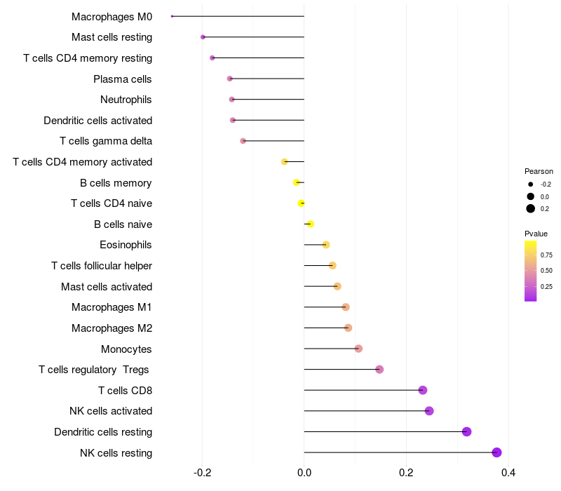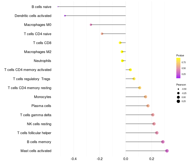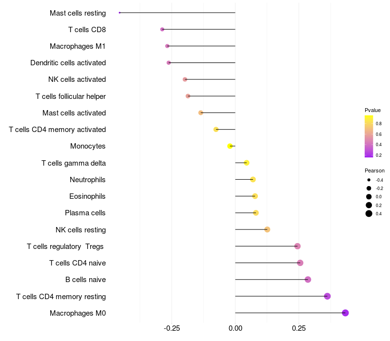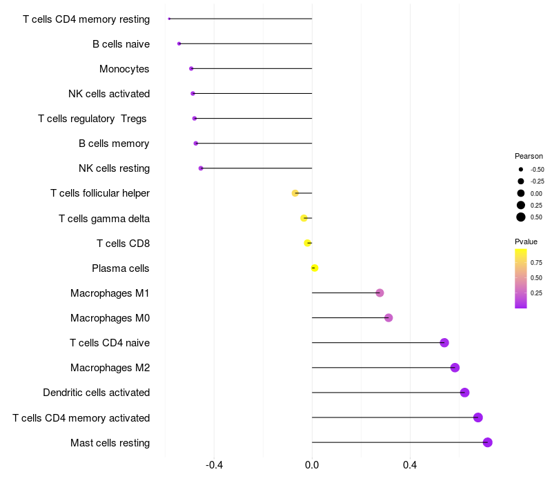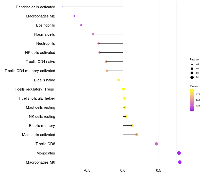 Lollipop of SLC45A2 expression and immune infiltrating cell level correlation result in EBV+ samples