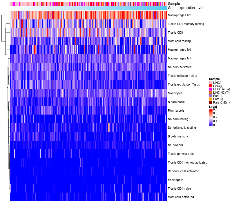 Liver hepatocellular carcinoma HCV (HBV+)(86), Liver hepatocellular carcinoma HCV (HBV-)(19), Liver hepatocellular carcinoma (HBV+)(209), Liver hepatocellular carcinoma (HBV+)(60), Paracancerous HCV (HBV+)(4), Paracancerous (HBV-)(28), Paracancerous (HBV+)(18) |