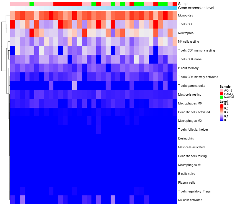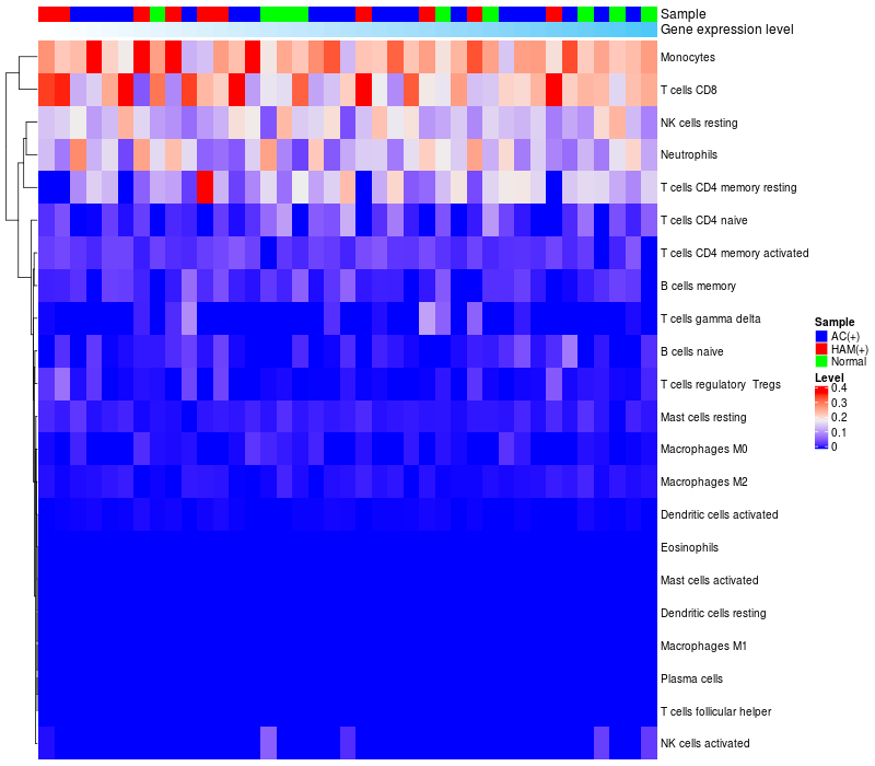 Normal (8), Asymptomatic carriers (HTLV1+)(17), HTLV-1-associated myelopathy (HTLV1+)(10) |