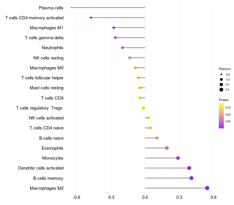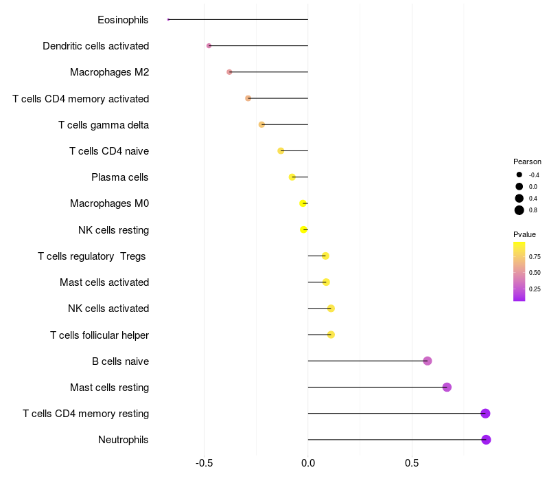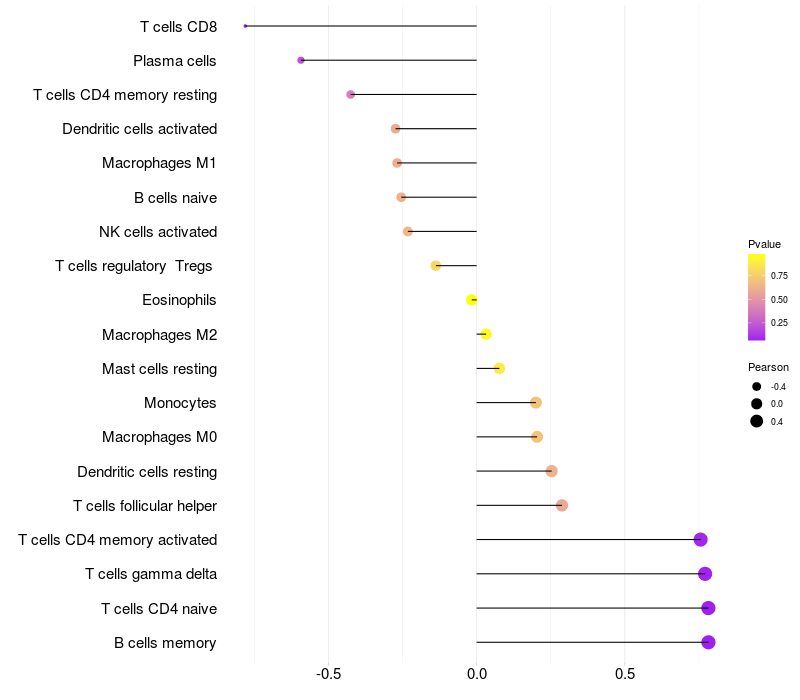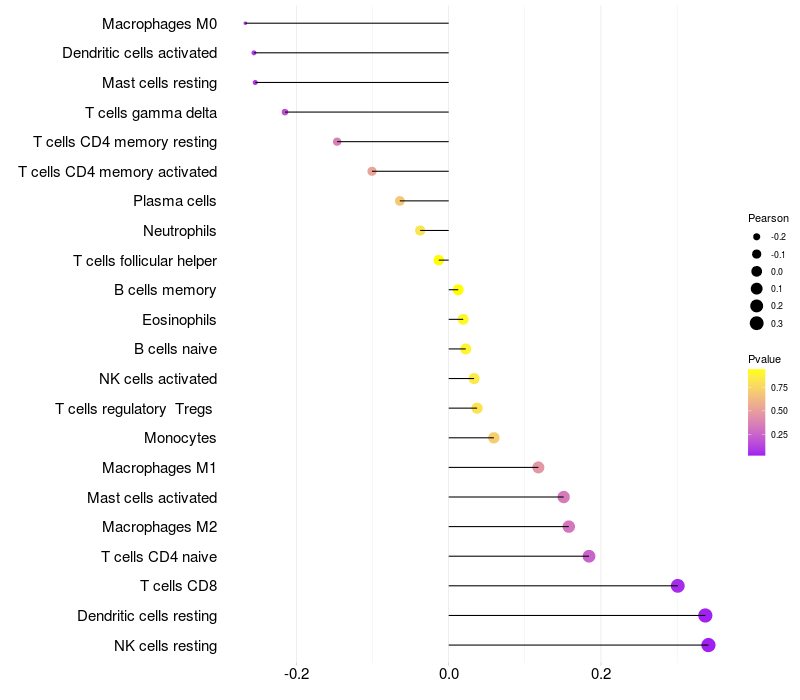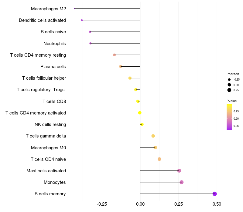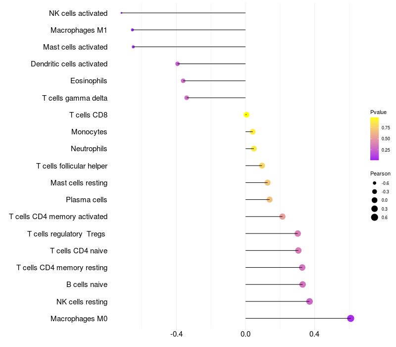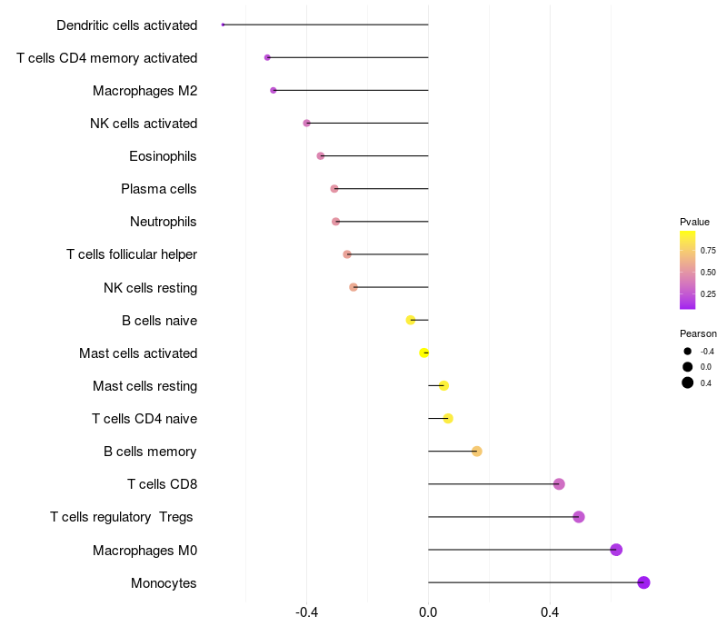 Lollipop of SLC6A4 expression and immune infiltrating cell level correlation result in EBV+ samples
