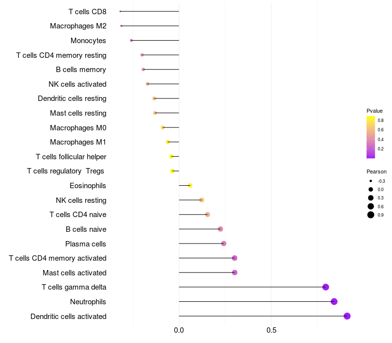 Lollipop of SLC7A10 expression and immune infiltrating cell level correlation result in HTLV1+ samples