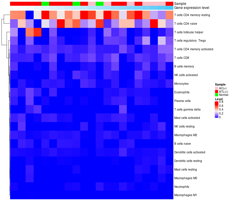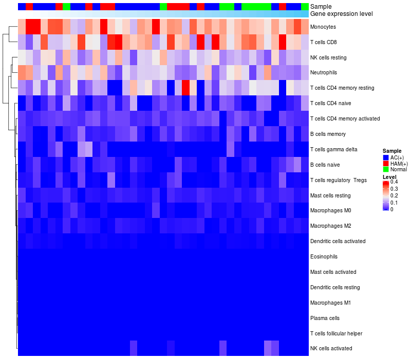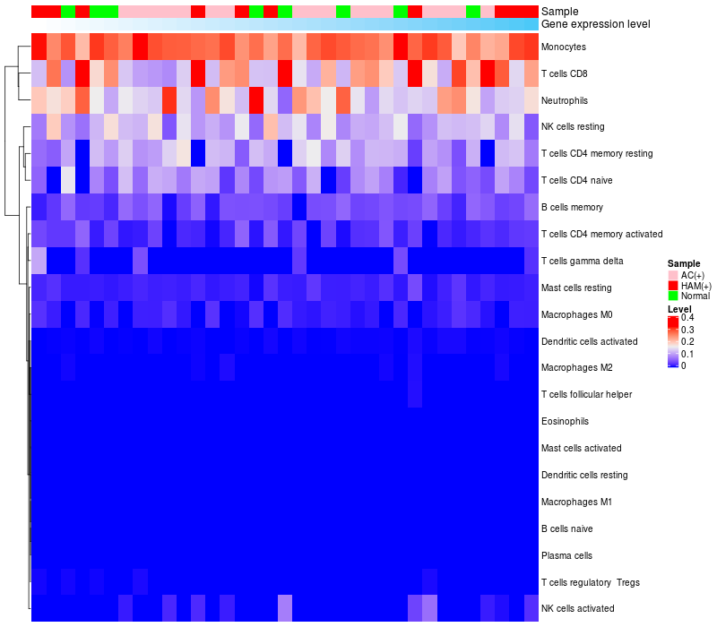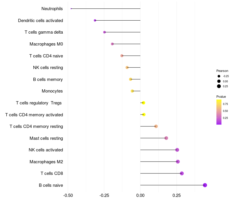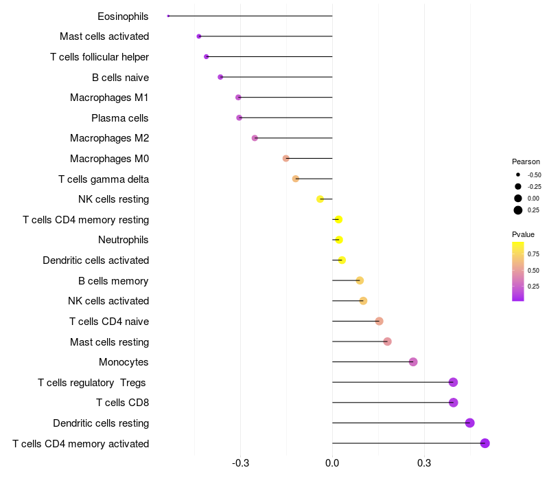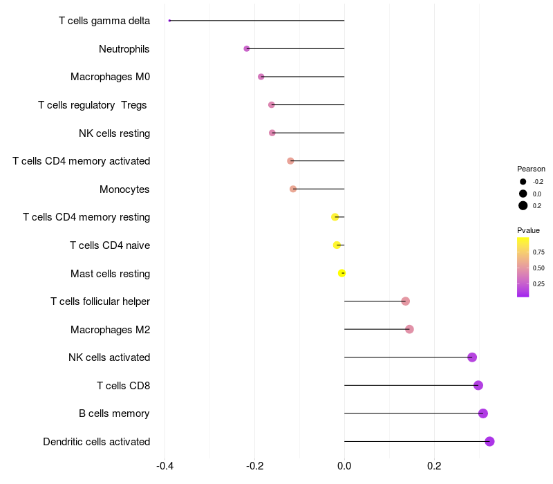 Lollipop of SLC7A6OS expression and immune infiltrating cell level correlation result in HTLV1+ samples