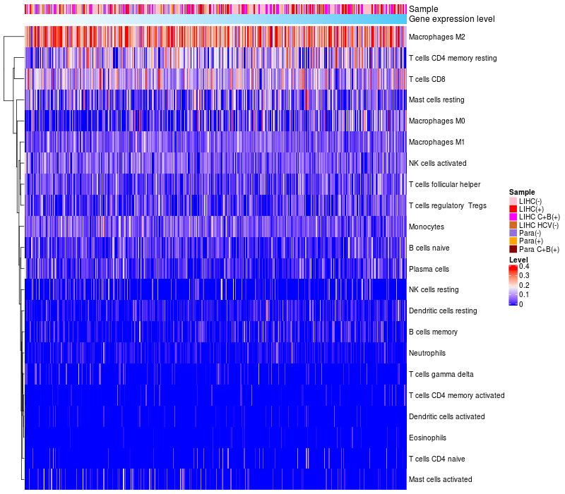 Liver hepatocellular carcinoma HCV (HBV+)(86), Liver hepatocellular carcinoma HCV (HBV-)(19), Liver hepatocellular carcinoma (HBV+)(209), Liver hepatocellular carcinoma (HBV+)(60), Paracancerous HCV (HBV+)(4), Paracancerous (HBV-)(28), Paracancerous (HBV+)(18) |