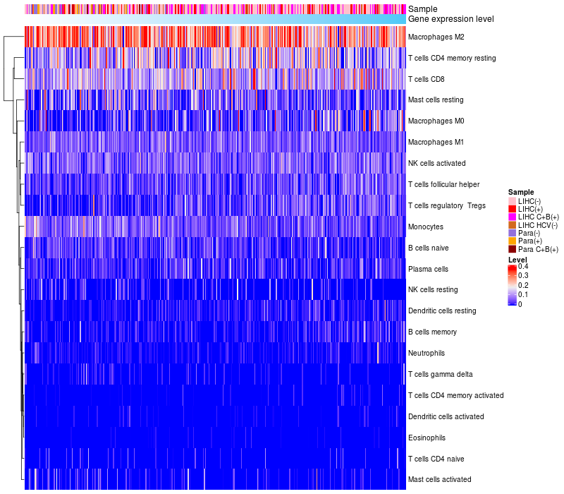Liver hepatocellular carcinoma HCV (HBV+)(86), Liver hepatocellular carcinoma HCV (HBV-)(19), Liver hepatocellular carcinoma (HBV+)(209), Liver hepatocellular carcinoma (HBV+)(60), Paracancerous HCV (HBV+)(4), Paracancerous (HBV-)(28), Paracancerous (HBV+)(18) |