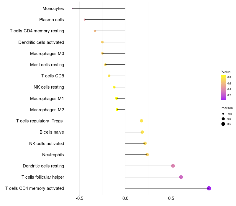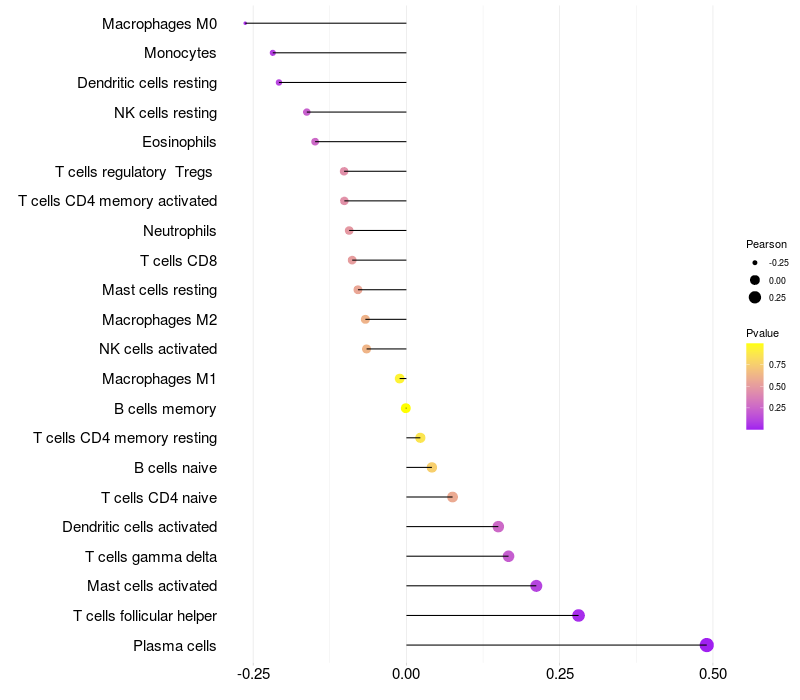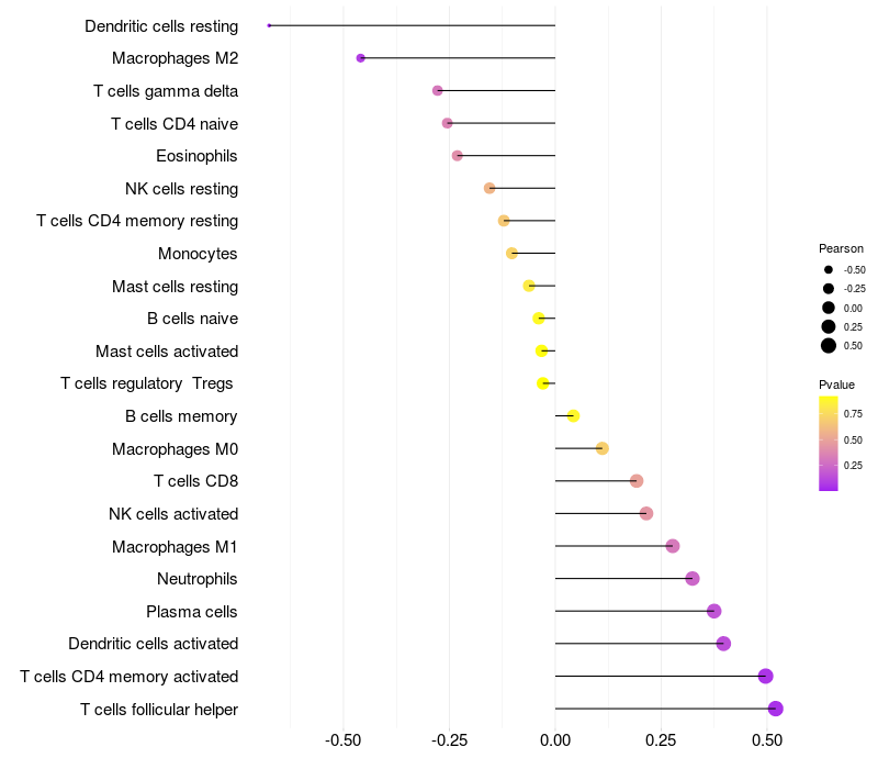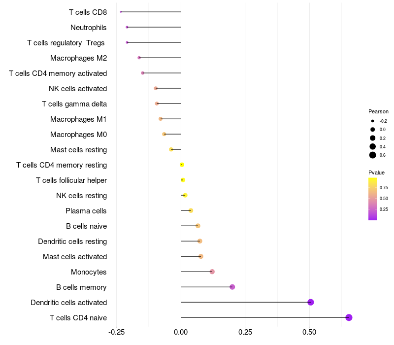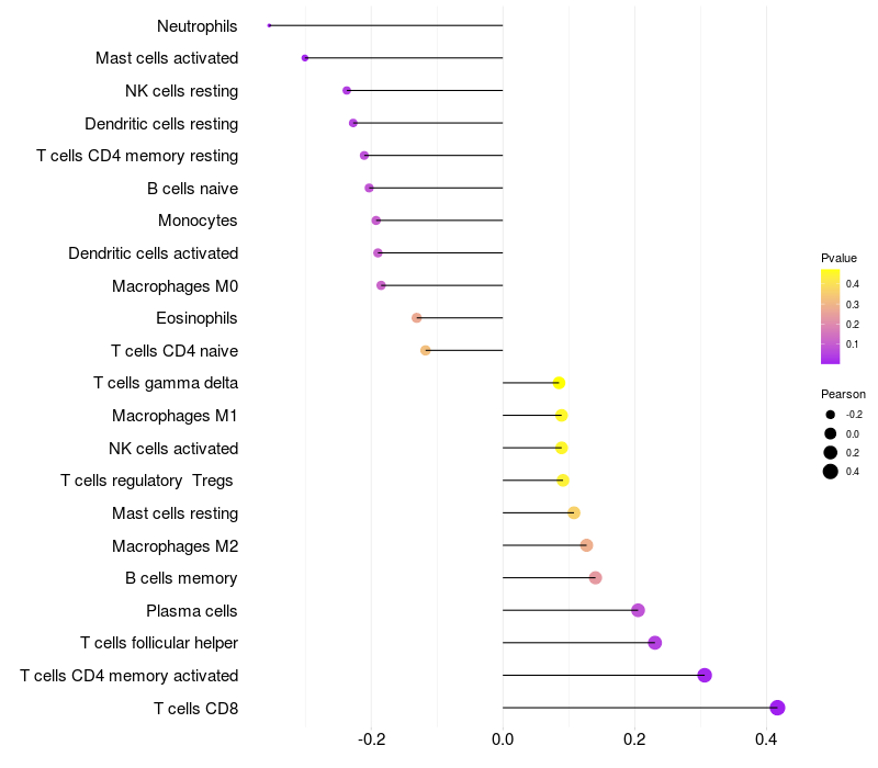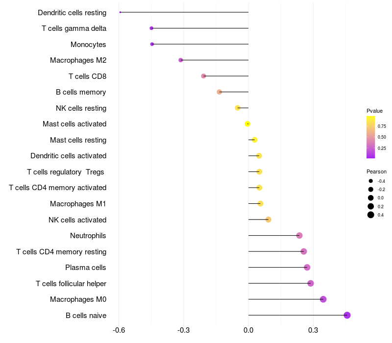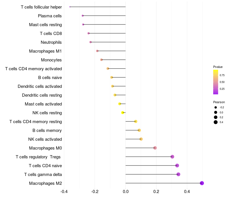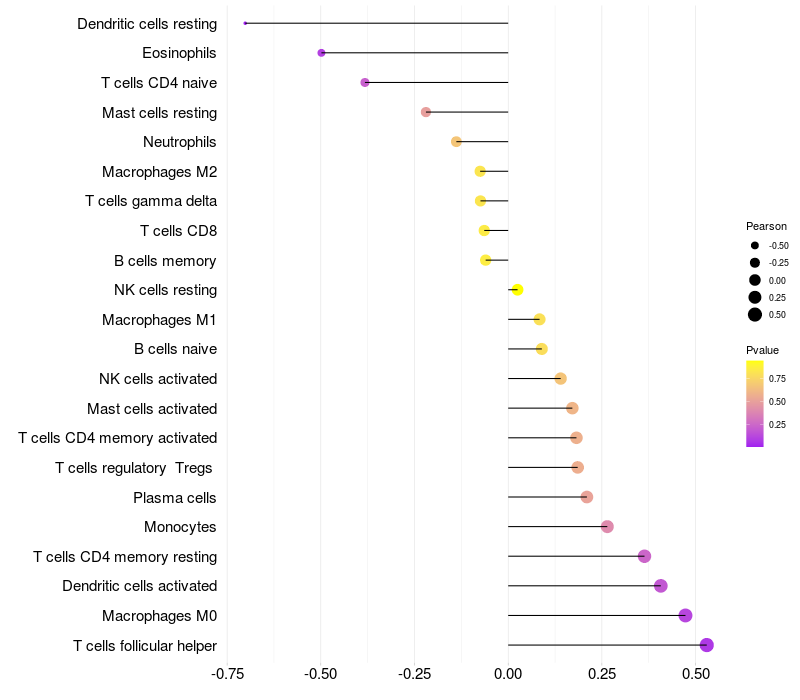 Lollipop of SMPDL3B expression and immune infiltrating cell level correlation result in HPV+ samples