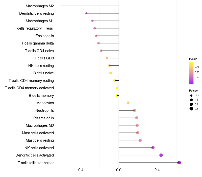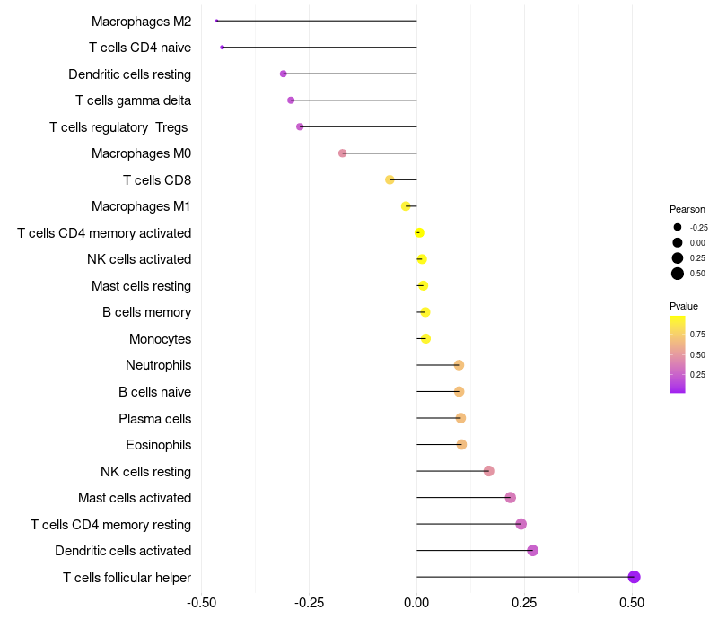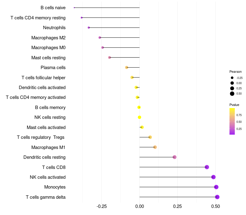 Lollipop of SNORD56B expression and immune infiltrating cell level correlation result in HPV+ samples