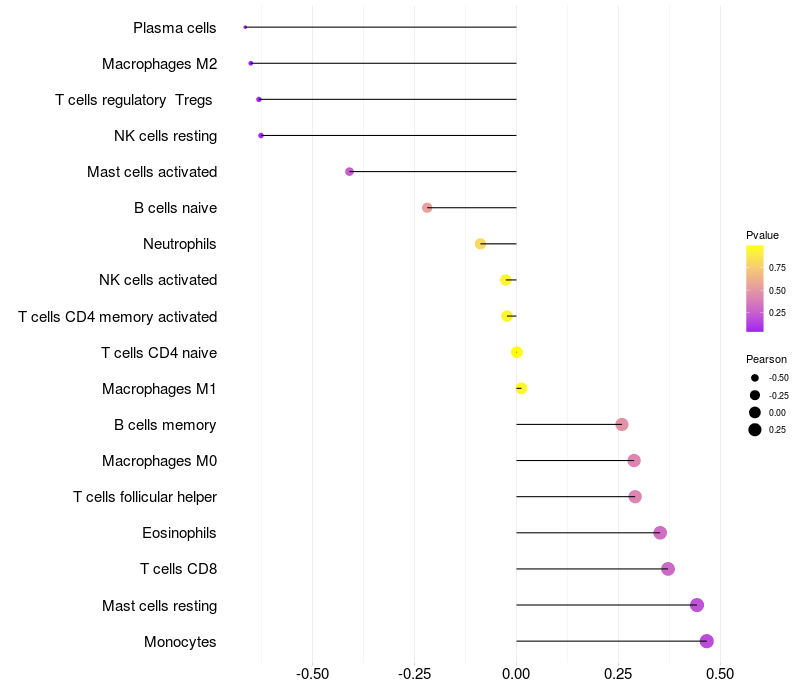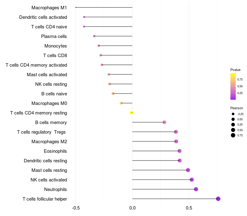 Lollipop of SNRPB expression and immune infiltrating cell level correlation result in HBV+ Chronic HBV (CHB) infection samples