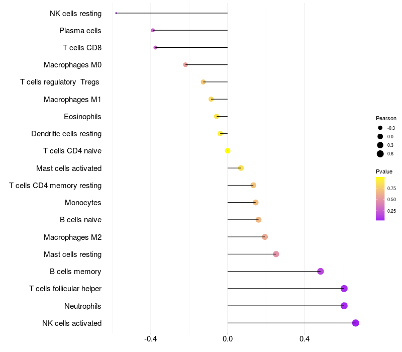 Lollipop of SNRPB expression and immune infiltrating cell level correlation result in HBV+ Liver cirrhosis samples
