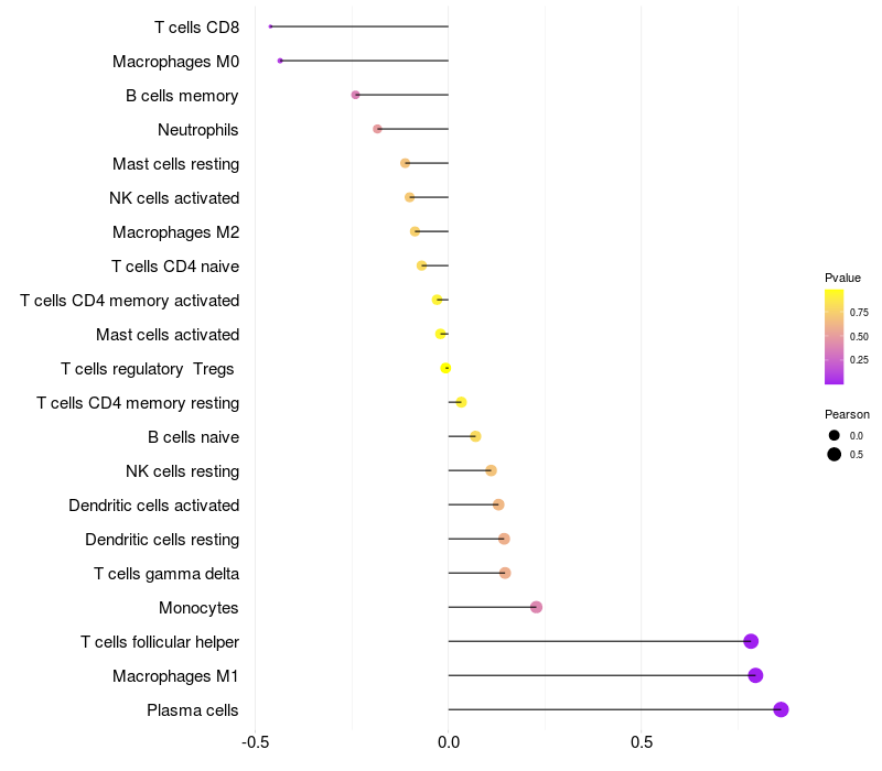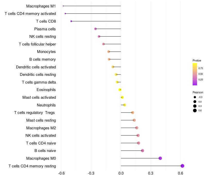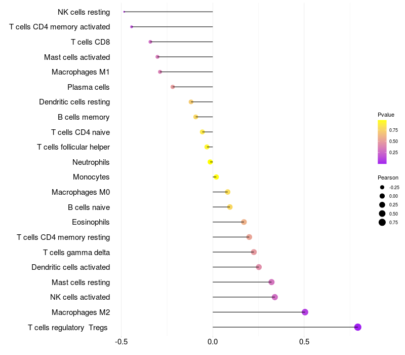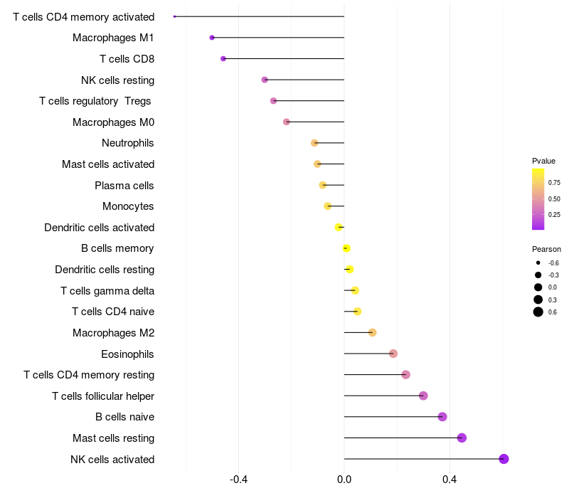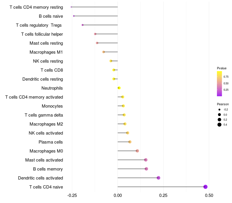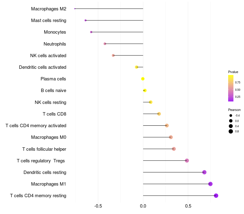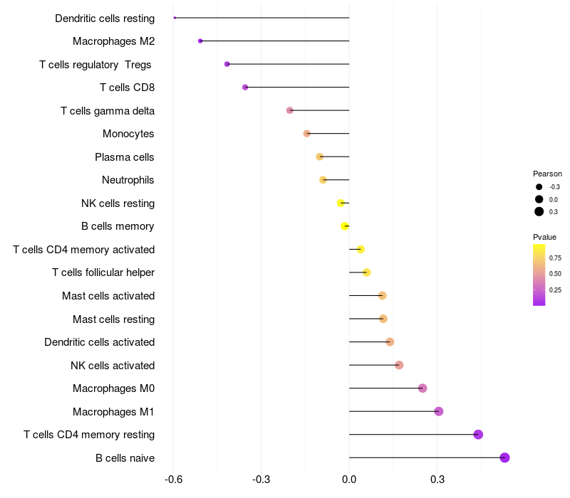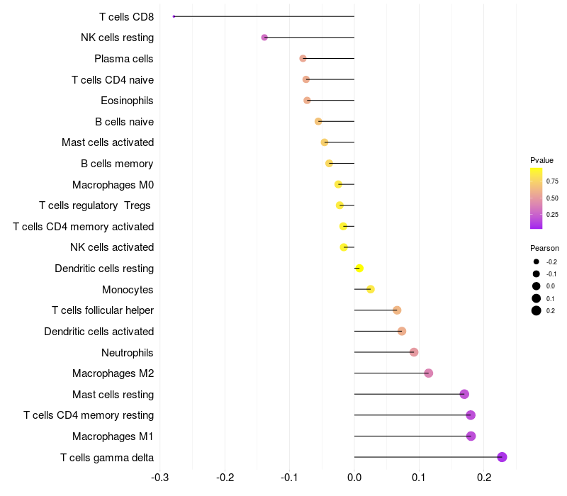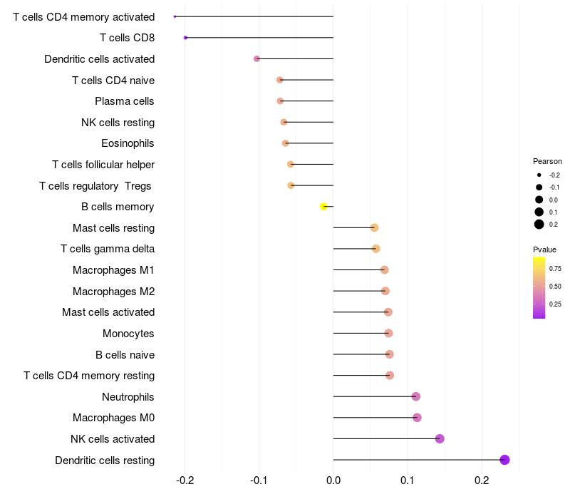 Lollipop of SNRPB2 expression and immune infiltrating cell level correlation result in HPV+ samples