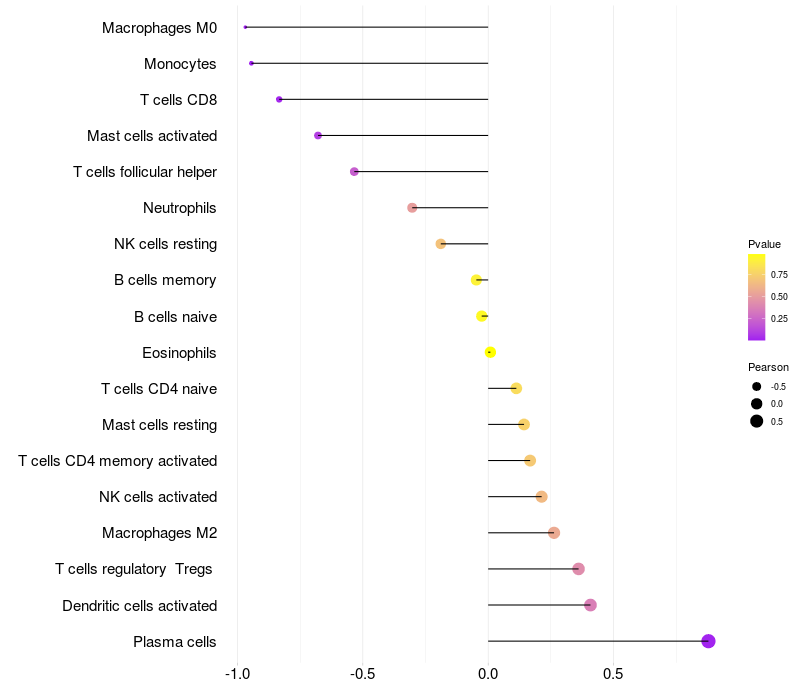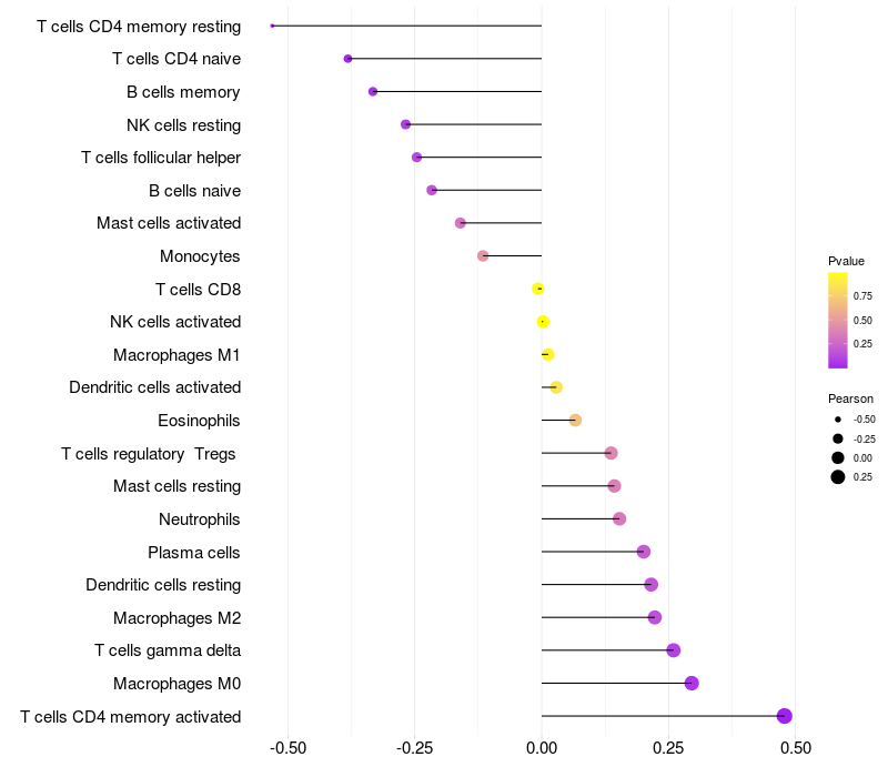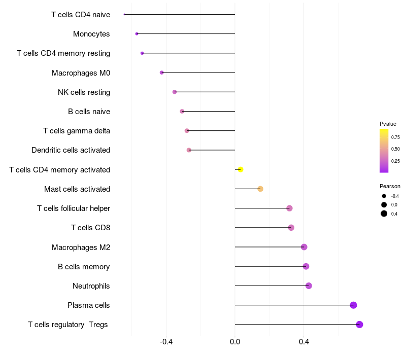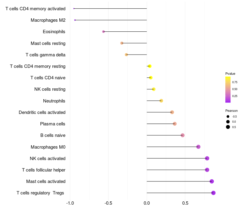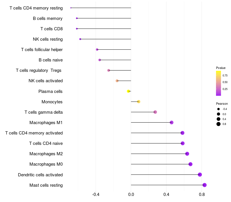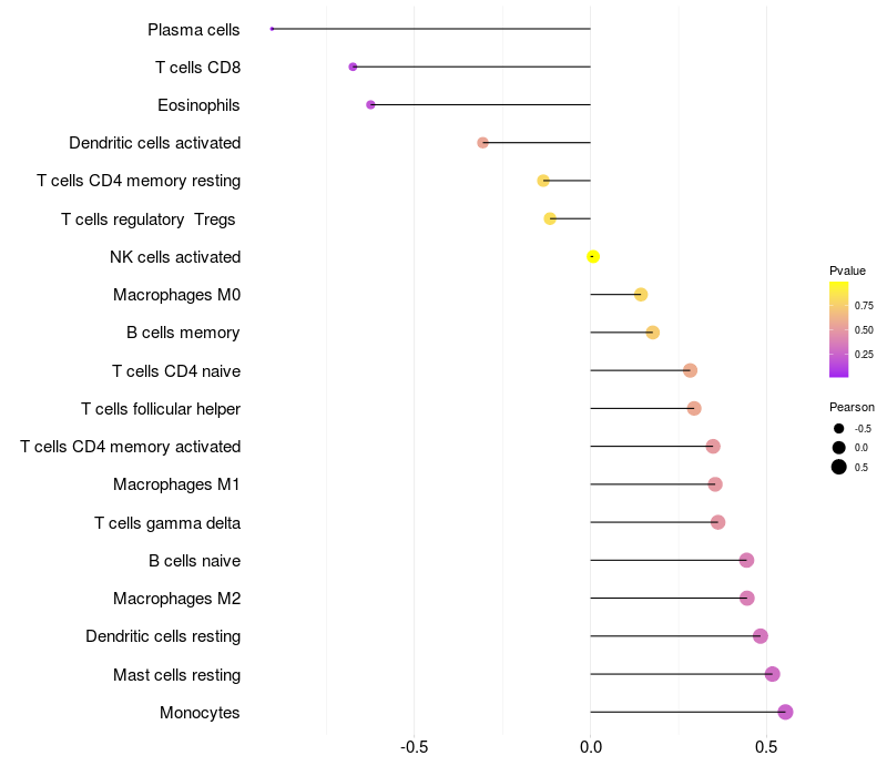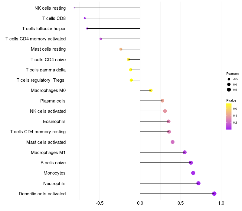 Lollipop of SNX10 expression and immune infiltrating cell level correlation result in EBV+ samples