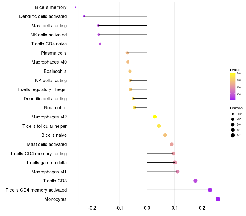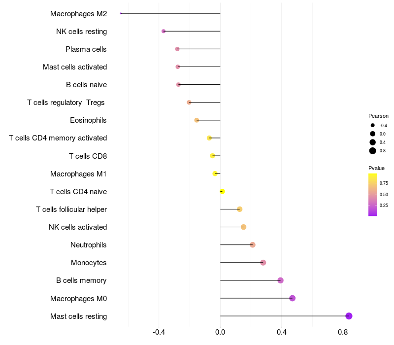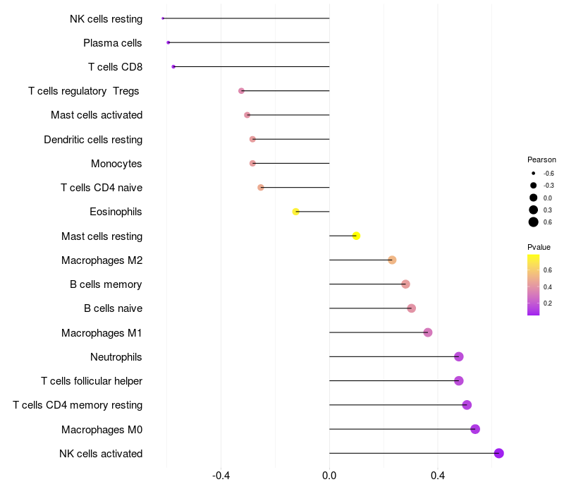 Lollipop of SNX14 expression and immune infiltrating cell level correlation result in HBV+ Liver cirrhosis samples