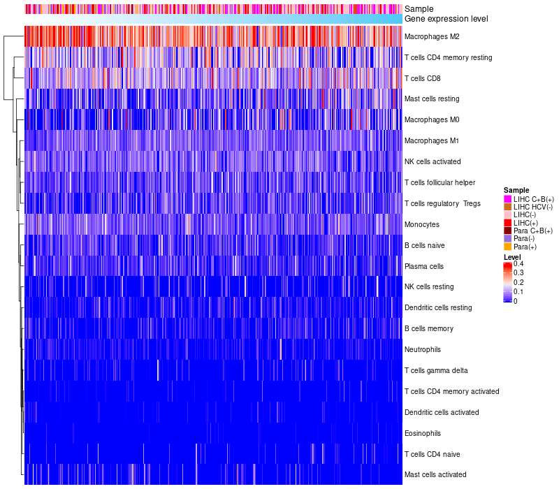 Liver hepatocellular carcinoma HCV (HBV+)(86), Liver hepatocellular carcinoma HCV (HBV-)(19), Liver hepatocellular carcinoma (HBV+)(209), Liver hepatocellular carcinoma (HBV+)(60), Paracancerous HCV (HBV+)(4), Paracancerous (HBV-)(28), Paracancerous (HBV+)(18) |