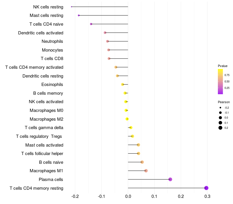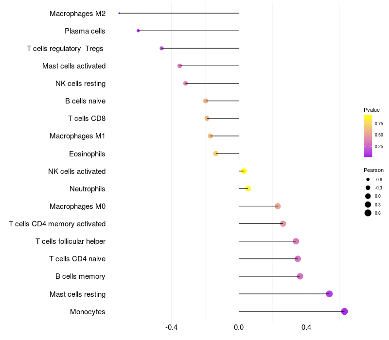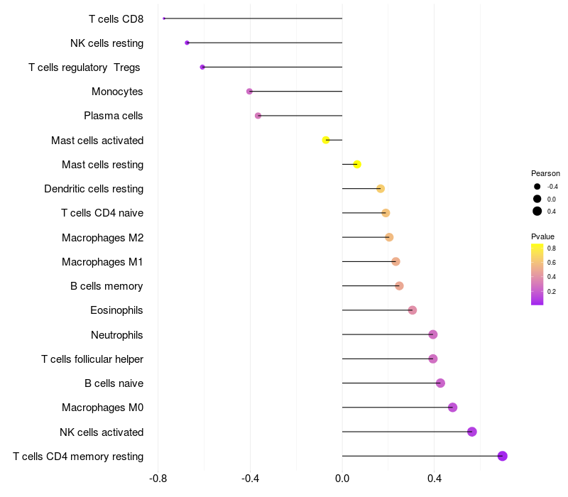 Lollipop of SNX6 expression and immune infiltrating cell level correlation result in HBV+ Liver cirrhosis samples