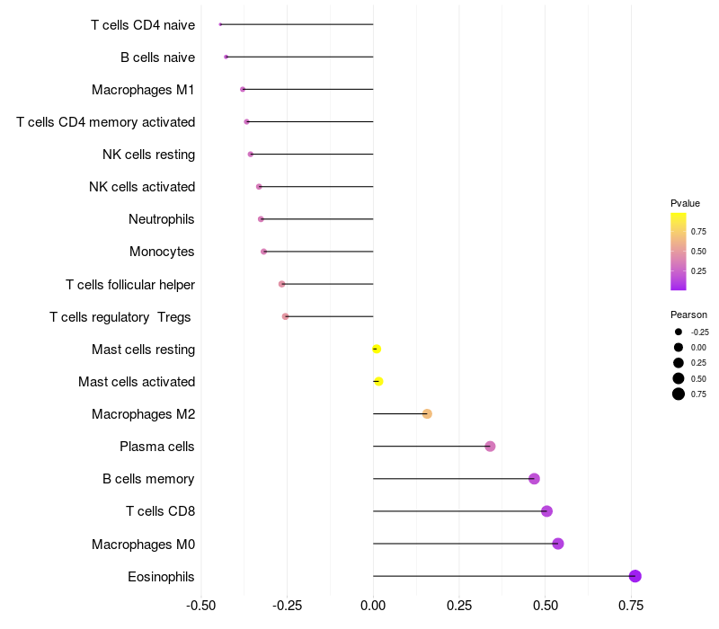 Lollipop of SORBS2 expression and immune infiltrating cell level correlation result in HBV+ Chronic HBV (CHB) infection samples