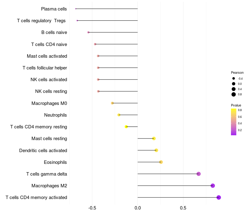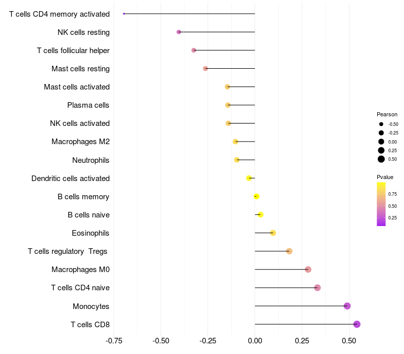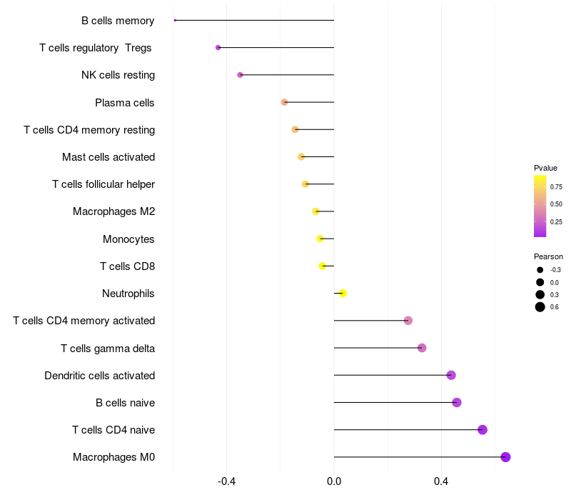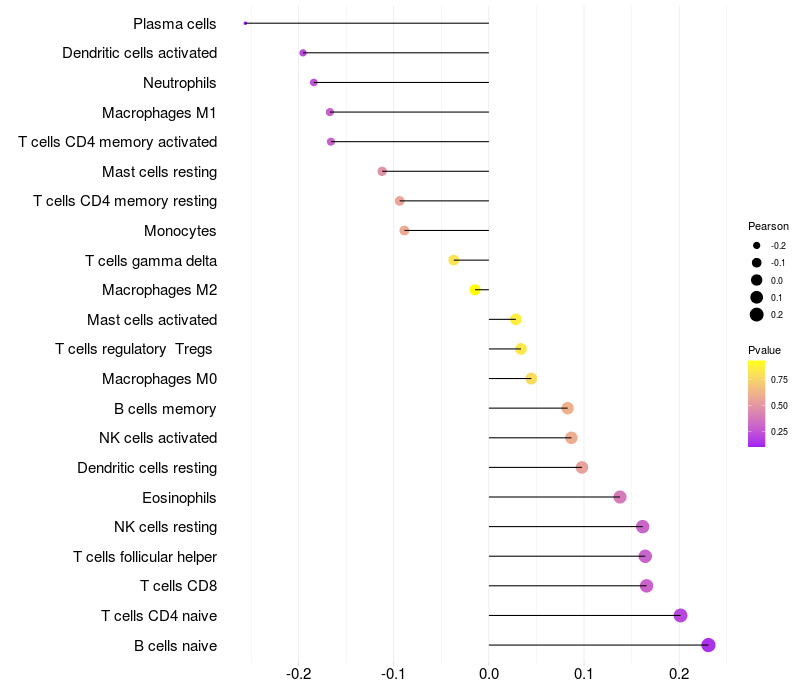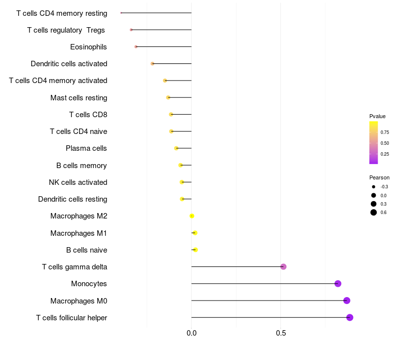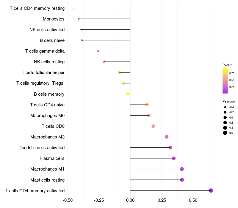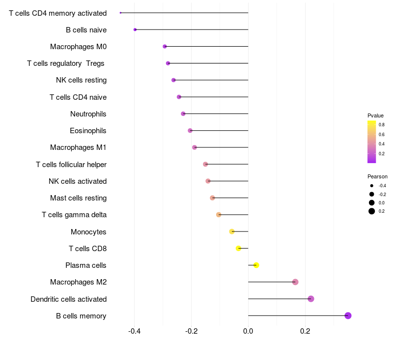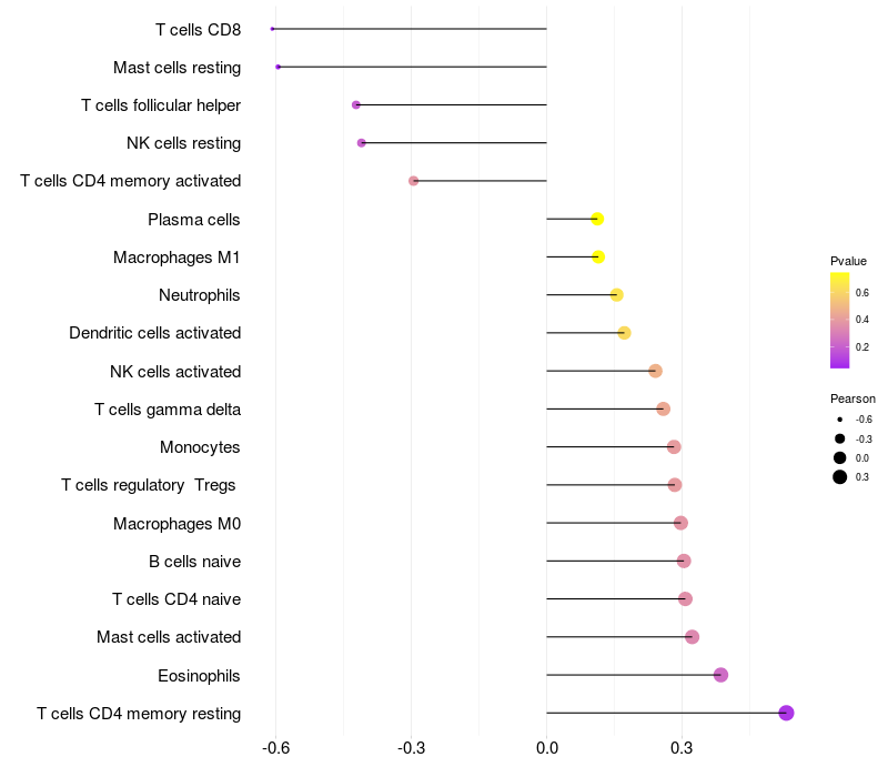 Lollipop of SORCS3 expression and immune infiltrating cell level correlation result in EBV+ samples