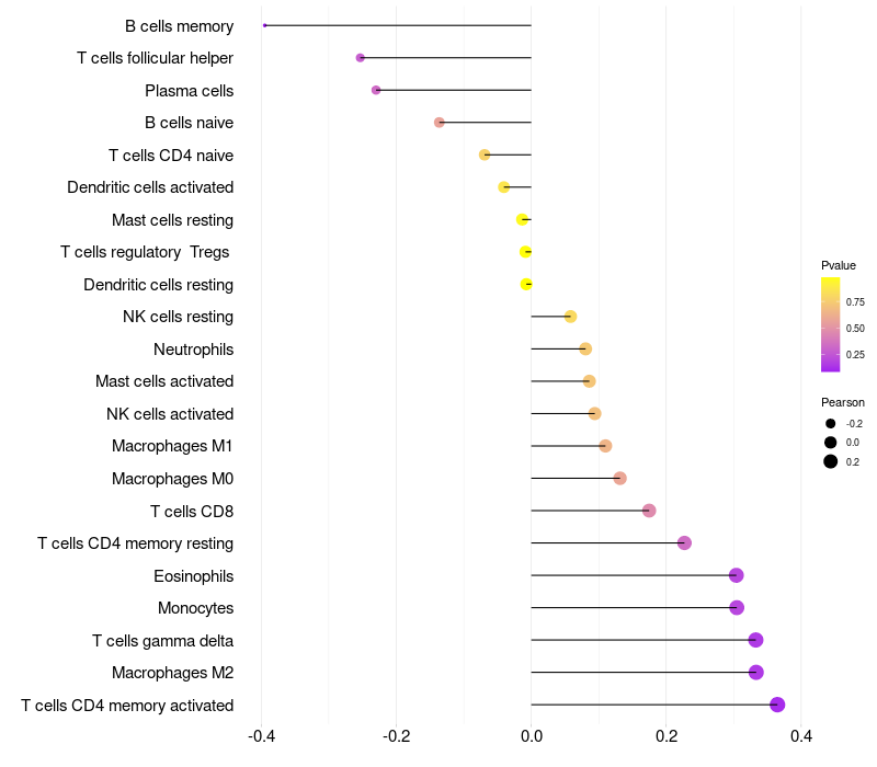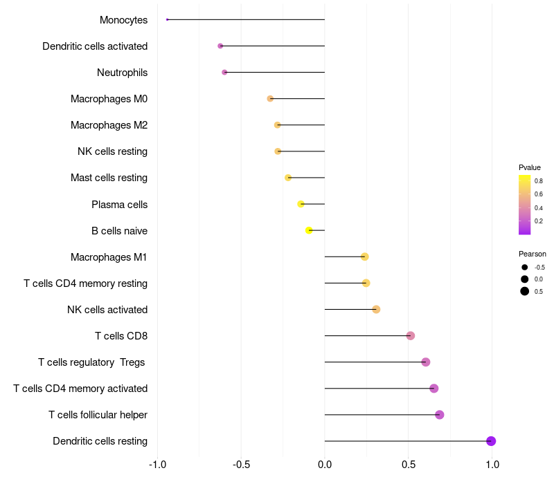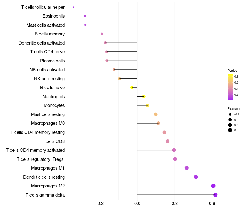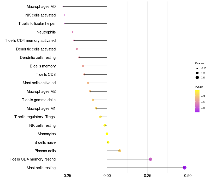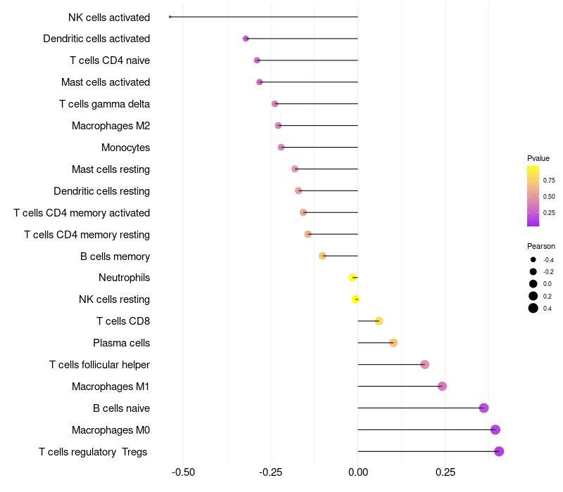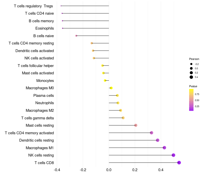 Lollipop of SOX3 expression and immune infiltrating cell level correlation result in HPV+ samples