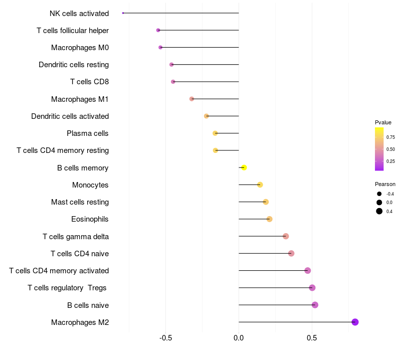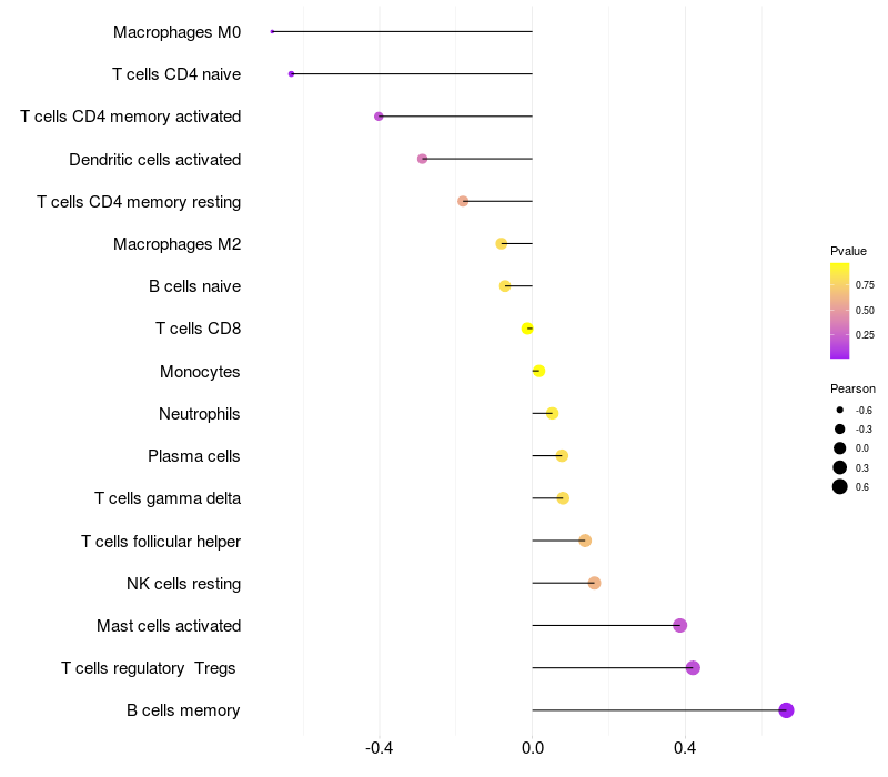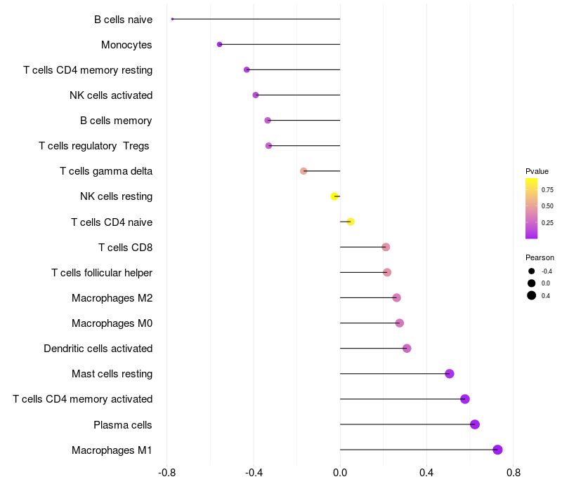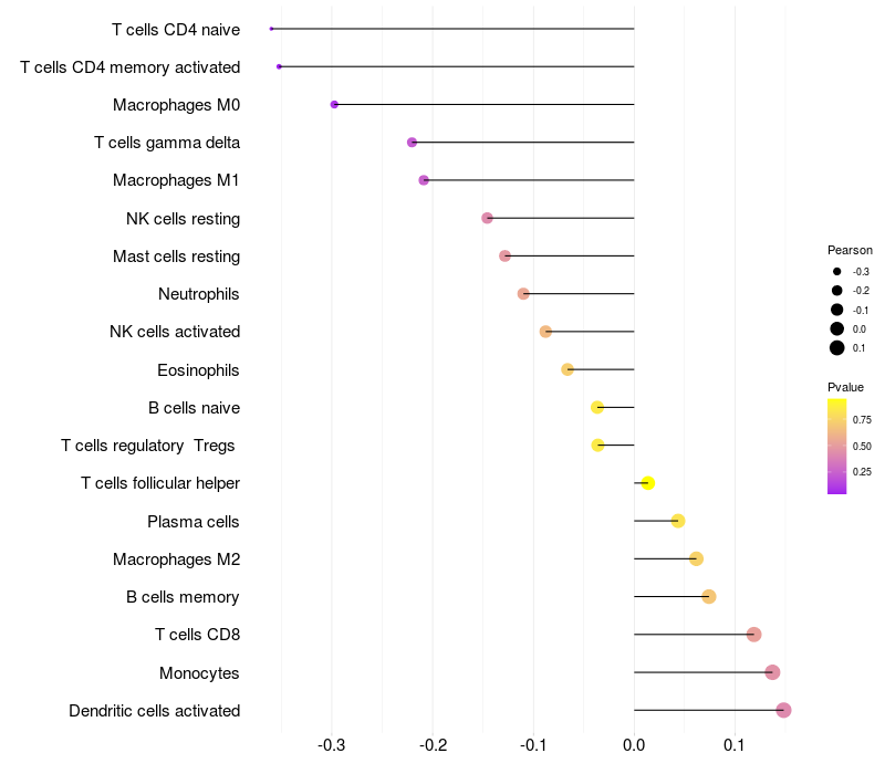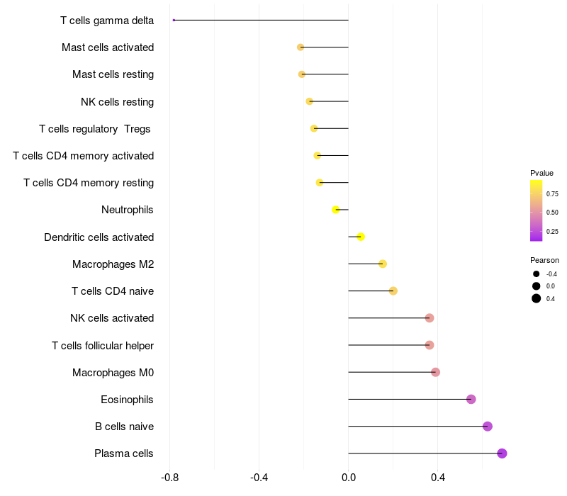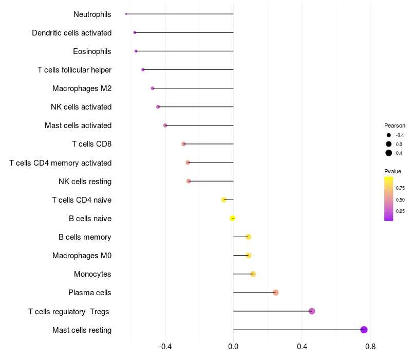 Lollipop of SOX5 expression and immune infiltrating cell level correlation result in EBV+ samples