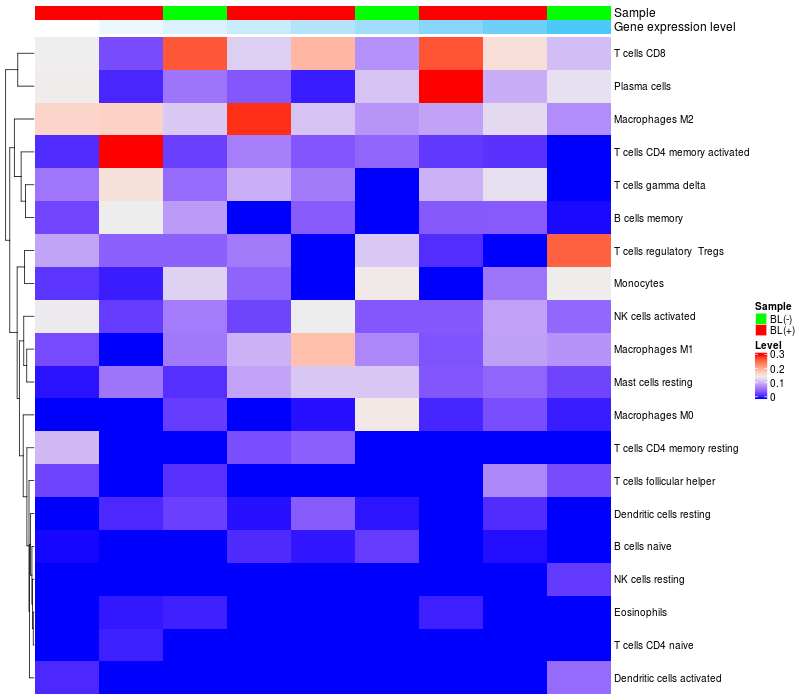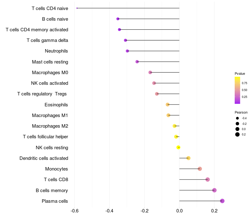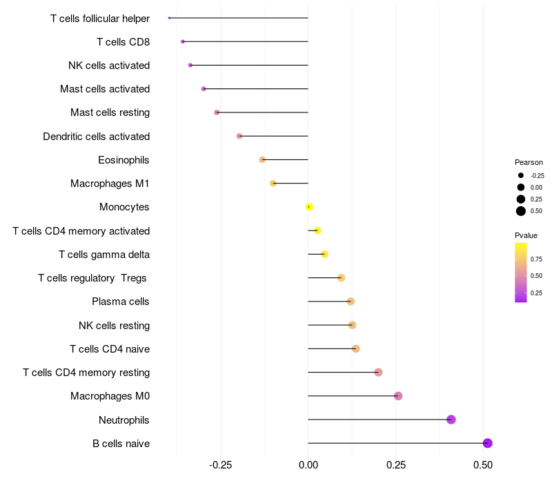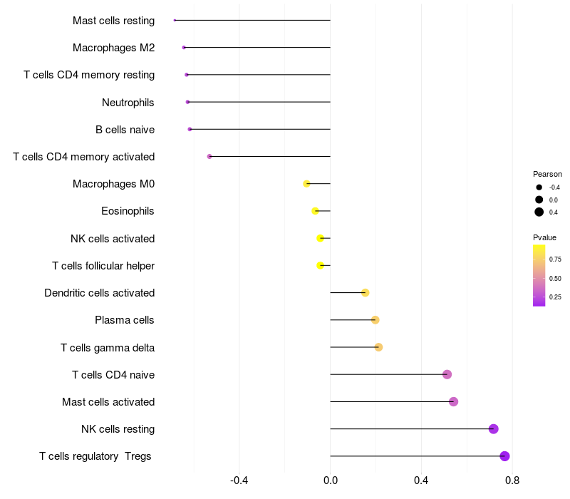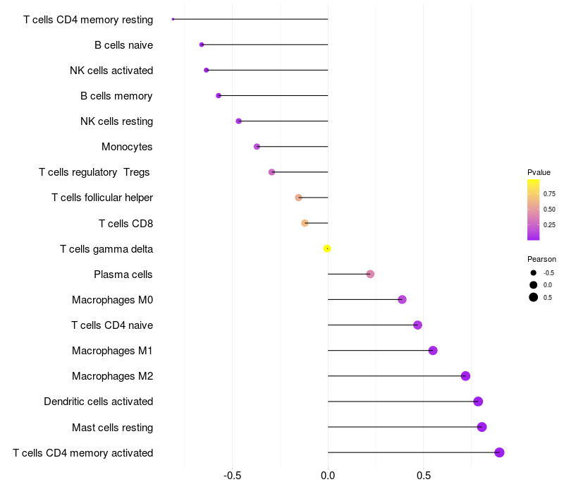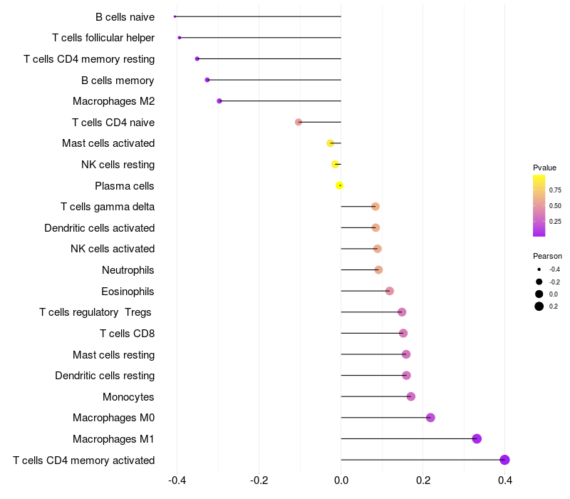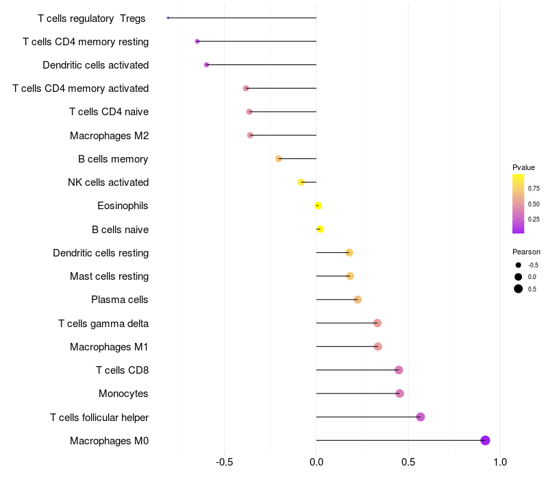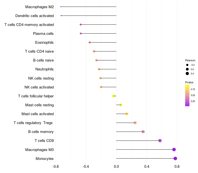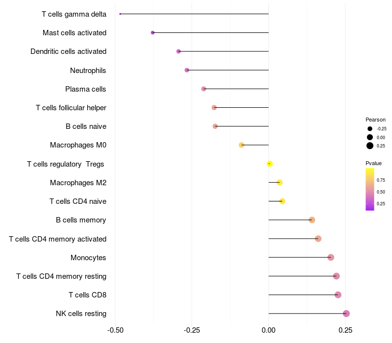 Lollipop of SOX6 expression and immune infiltrating cell level correlation result in EBV+ samples