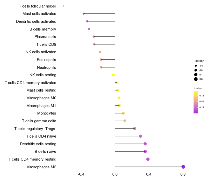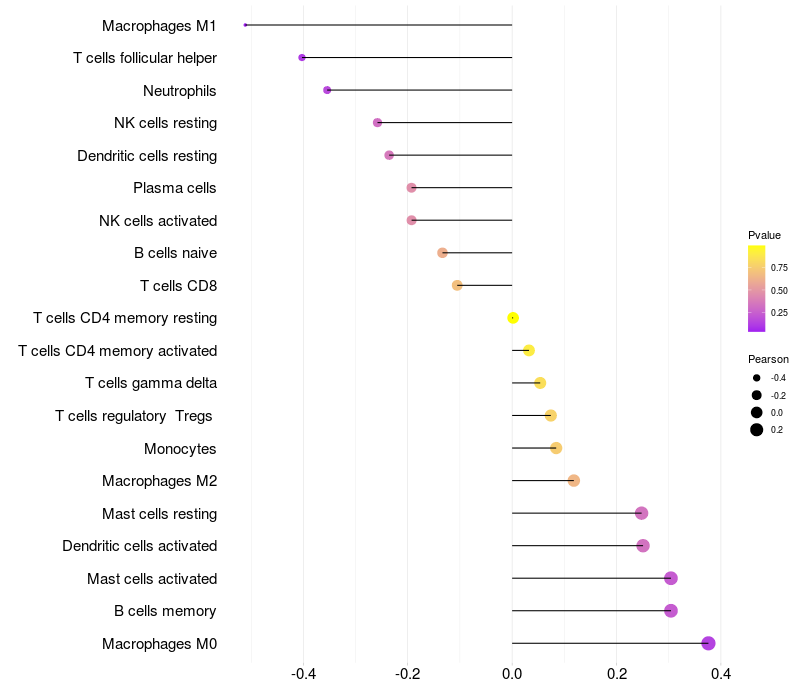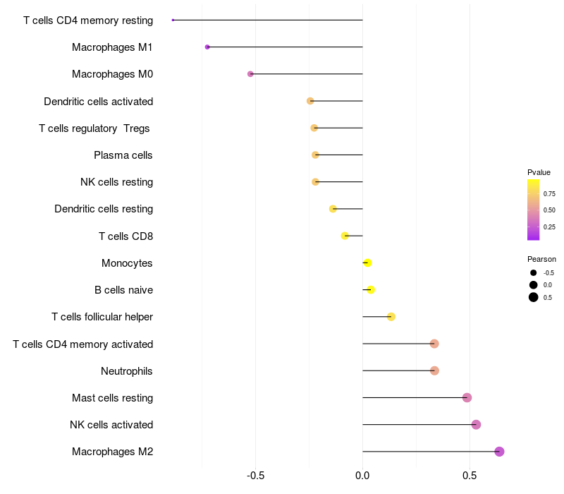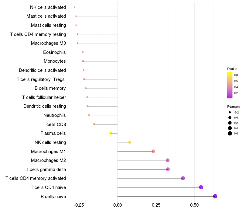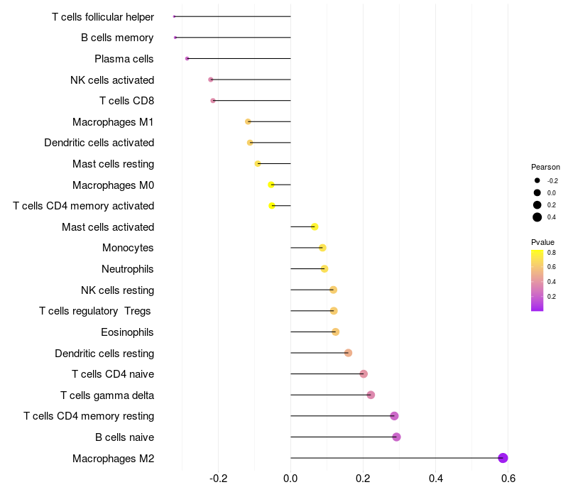 Lollipop of SPANXN1 expression and immune infiltrating cell level correlation result in HPV+ samples
