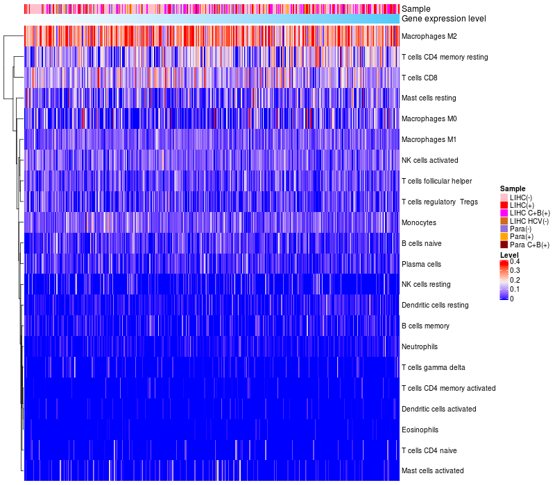 Liver hepatocellular carcinoma HCV (HBV+)(86), Liver hepatocellular carcinoma HCV (HBV-)(19), Liver hepatocellular carcinoma (HBV+)(209), Liver hepatocellular carcinoma (HBV+)(60), Paracancerous HCV (HBV+)(4), Paracancerous (HBV-)(28), Paracancerous (HBV+)(18) |