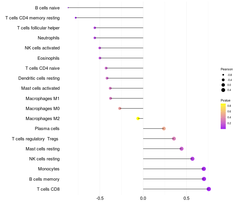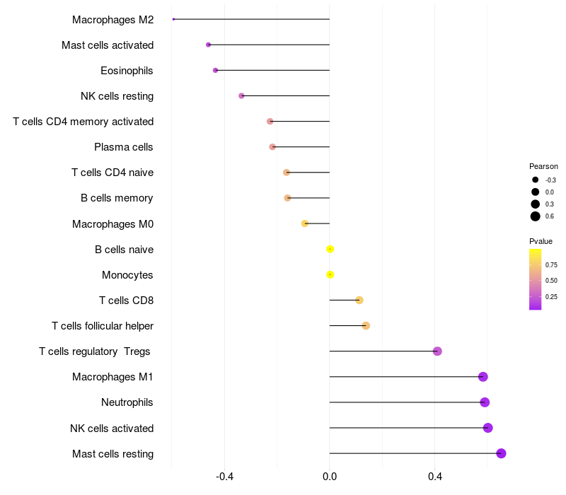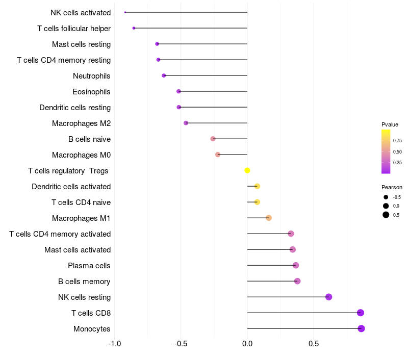 Lollipop of SPATA13 expression and immune infiltrating cell level correlation result in HBV+ Chronic HBV (CHB) infection samples