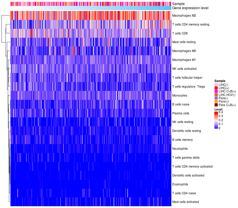 Liver hepatocellular carcinoma HCV (HBV+)(86), Liver hepatocellular carcinoma HCV (HBV-)(19), Liver hepatocellular carcinoma (HBV+)(209), Liver hepatocellular carcinoma (HBV+)(60), Paracancerous HCV (HBV+)(4), Paracancerous (HBV-)(28), Paracancerous (HBV+)(18) |