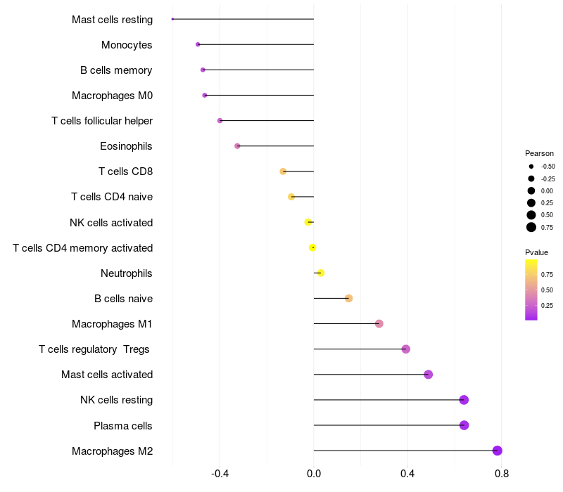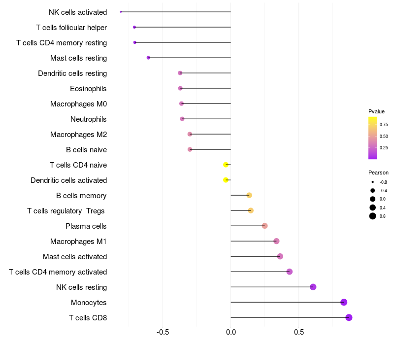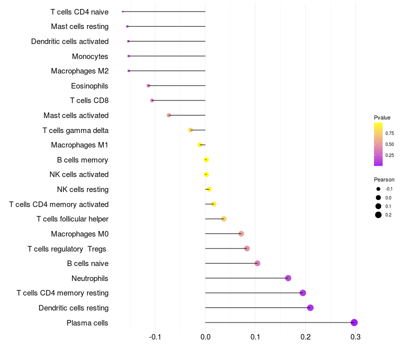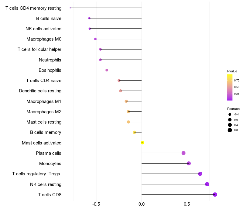 Lollipop of SPATC1 expression and immune infiltrating cell level correlation result in HBV+ Liver cirrhosis samples