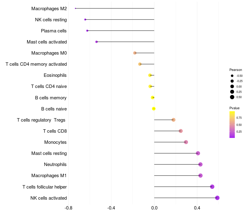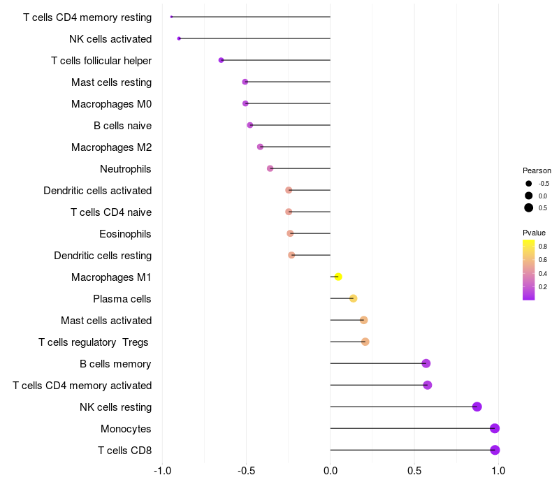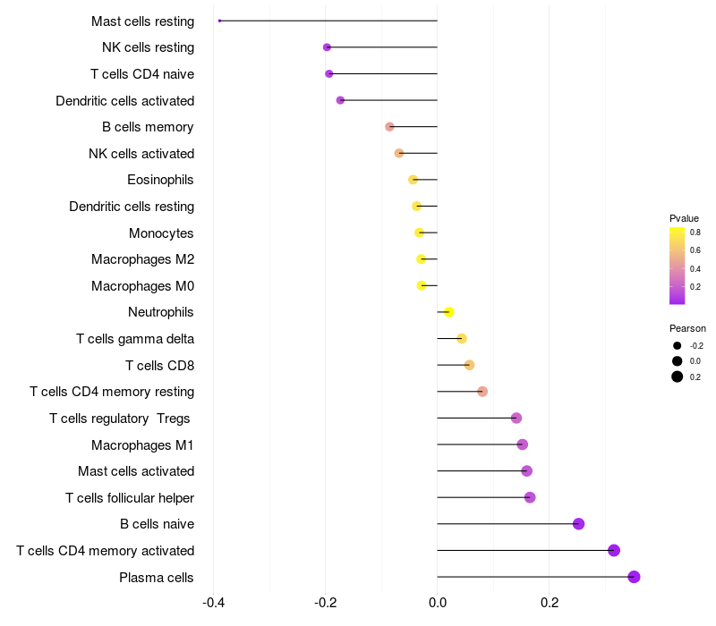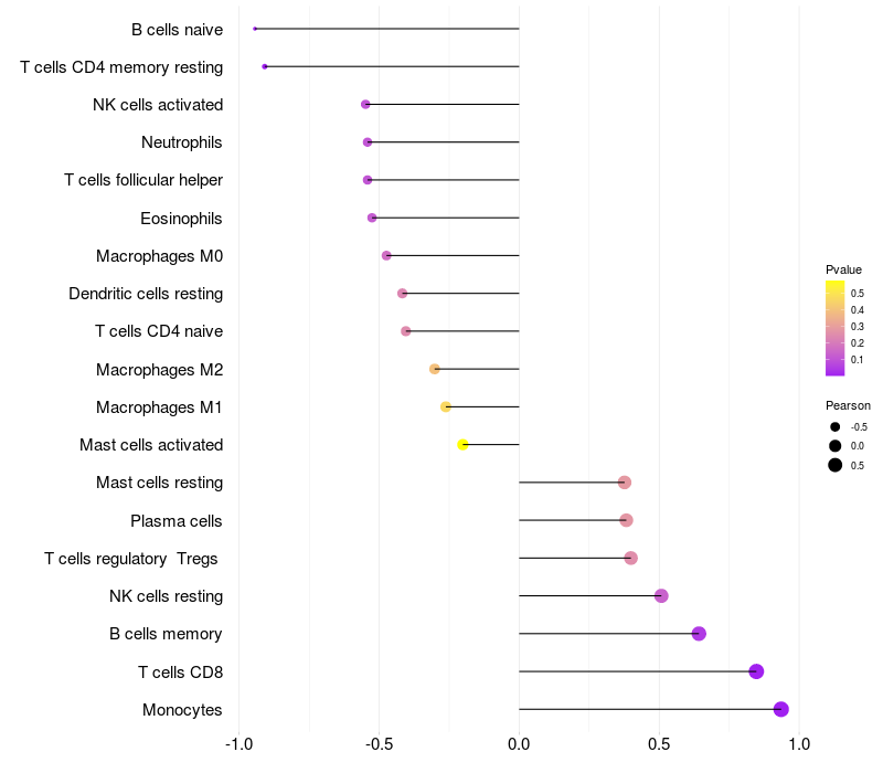 Lollipop of SPI1 expression and immune infiltrating cell level correlation result in HBV+ Liver cirrhosis samples