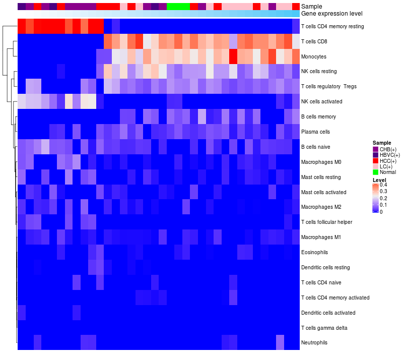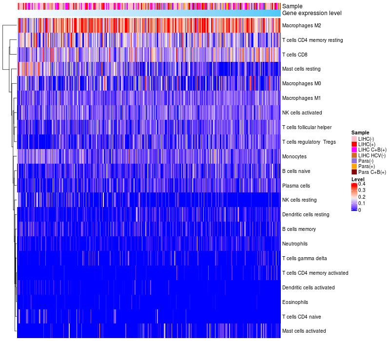 Liver hepatocellular carcinoma HCV (HBV+)(86), Liver hepatocellular carcinoma HCV (HBV-)(19), Liver hepatocellular carcinoma (HBV+)(209), Liver hepatocellular carcinoma (HBV+)(60), Paracancerous HCV (HBV+)(4), Paracancerous (HBV-)(28), Paracancerous (HBV+)(18) |