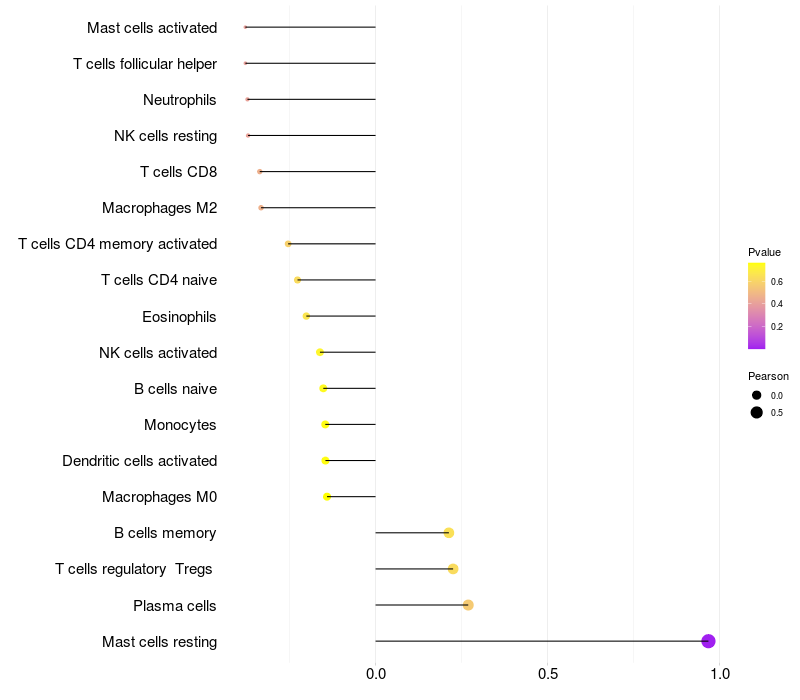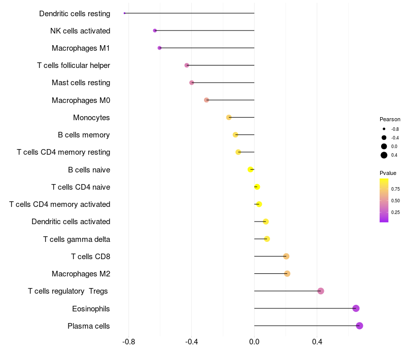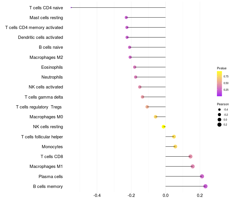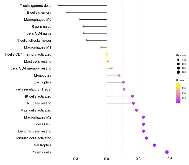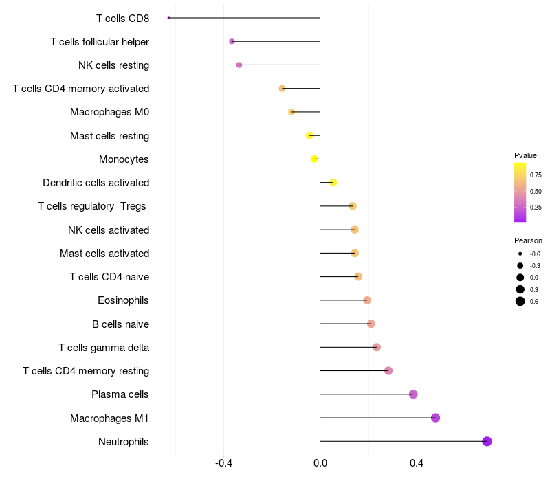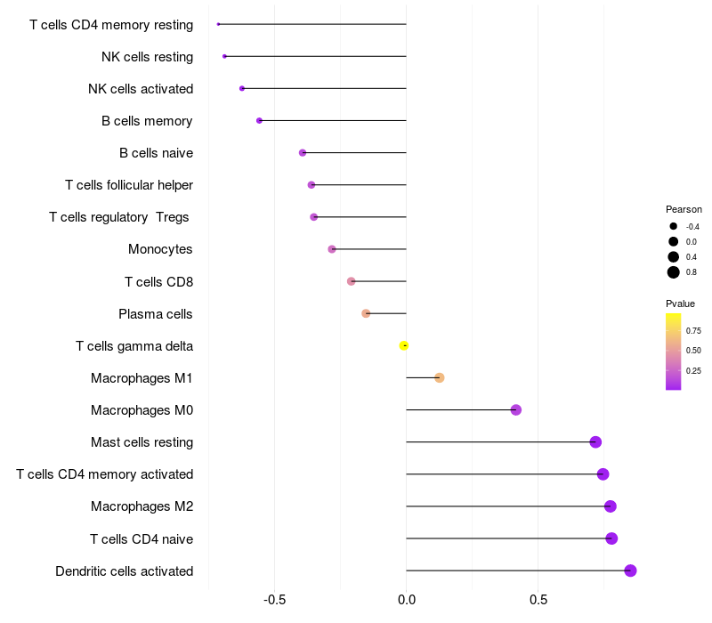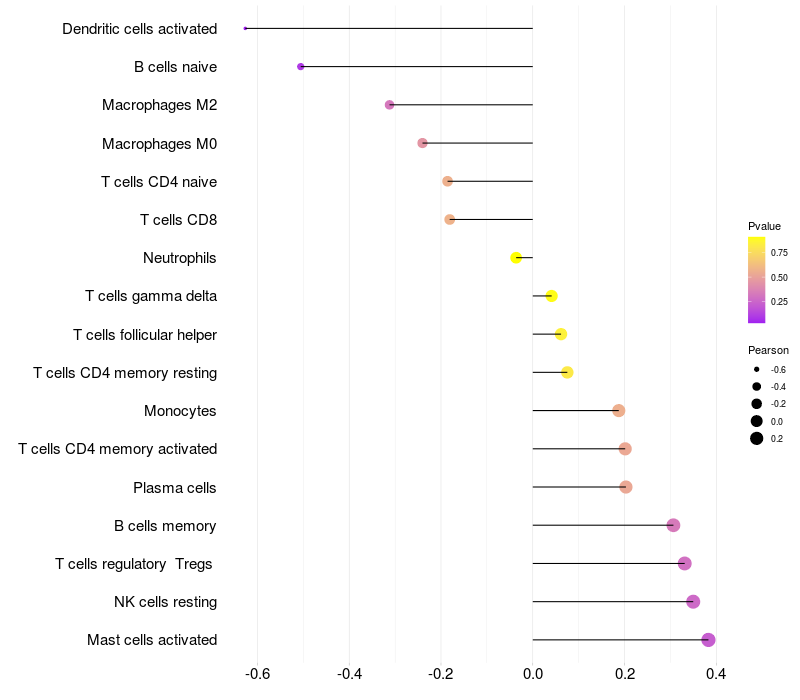 Lollipop of SPOCK1 expression and immune infiltrating cell level correlation result in EBV+ samples
