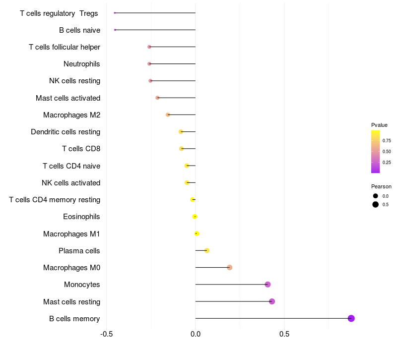 Lollipop of SRA1 expression and immune infiltrating cell level correlation result in HBV+ Liver cirrhosis samples