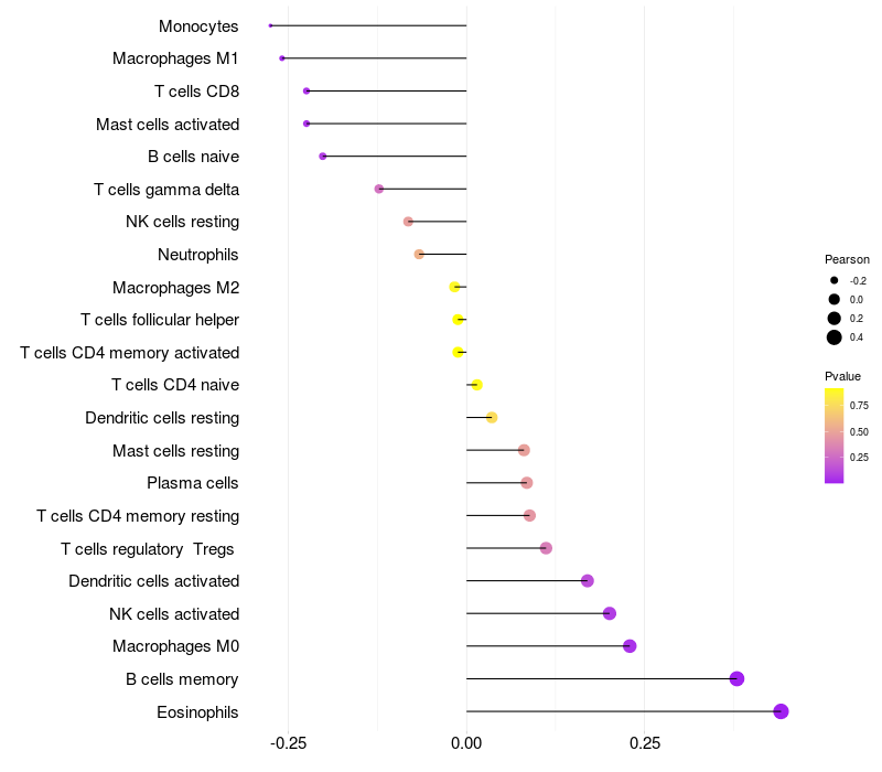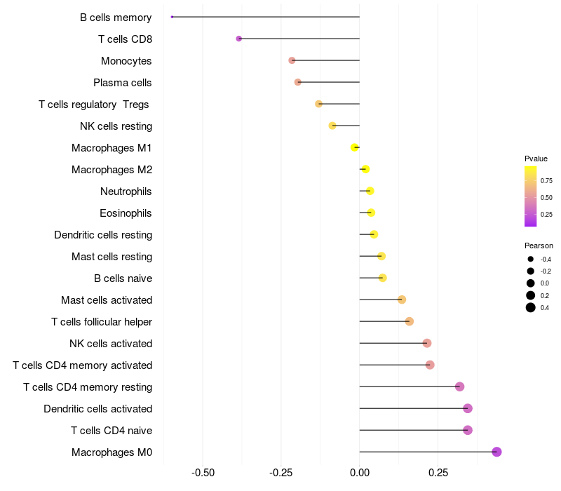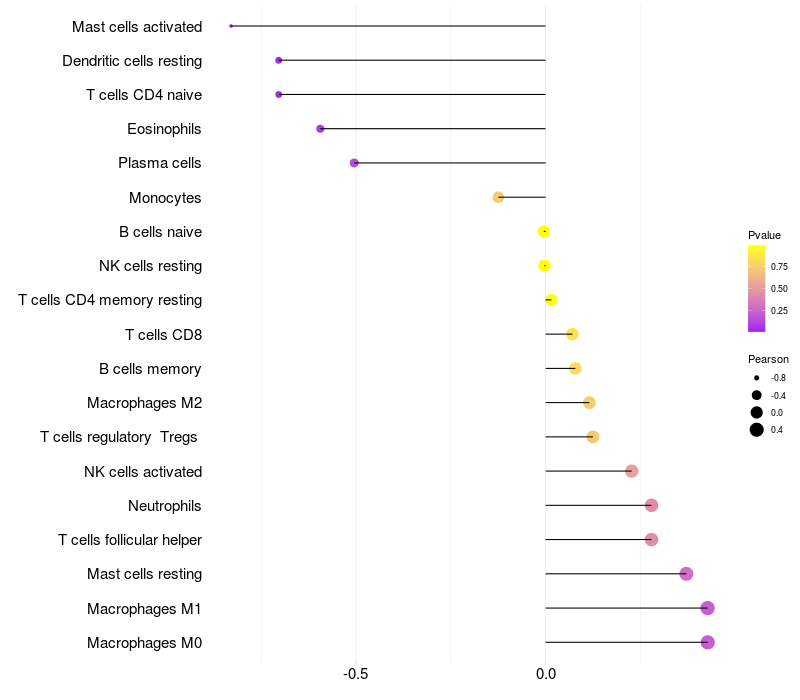 Lollipop of SRCAP expression and immune infiltrating cell level correlation result in HBV+ Liver cirrhosis samples