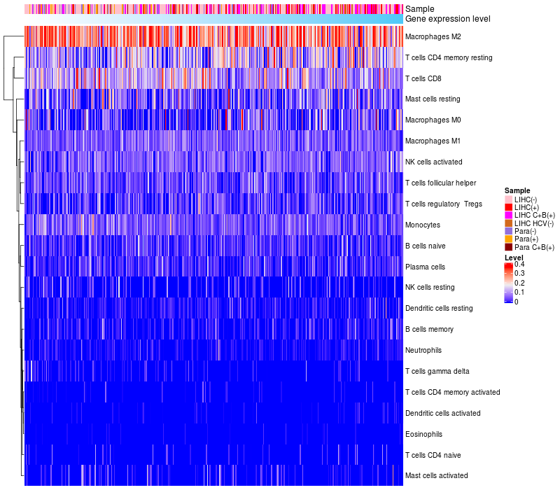 Liver hepatocellular carcinoma HCV (HBV+)(86), Liver hepatocellular carcinoma HCV (HBV-)(19), Liver hepatocellular carcinoma (HBV+)(209), Liver hepatocellular carcinoma (HBV+)(60), Paracancerous HCV (HBV+)(4), Paracancerous (HBV-)(28), Paracancerous (HBV+)(18) |