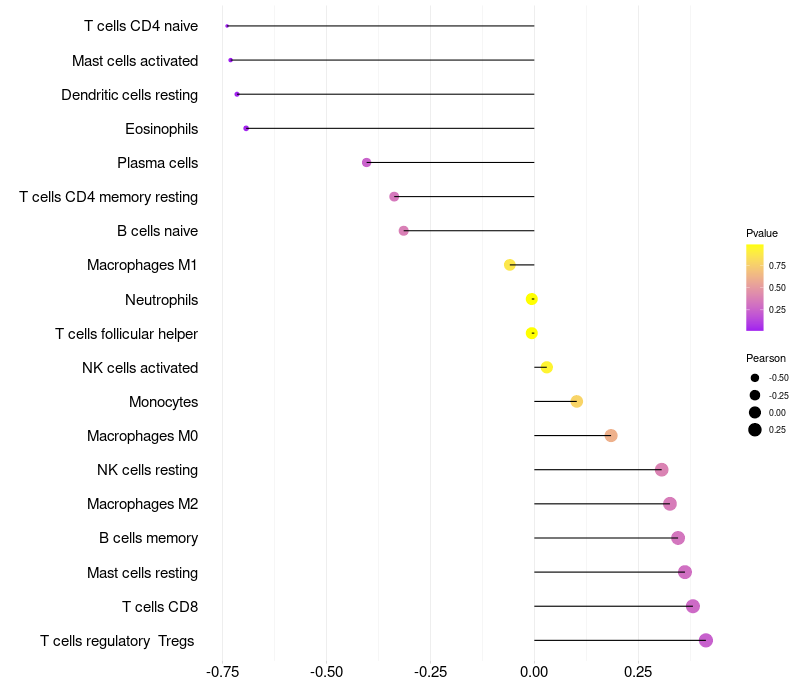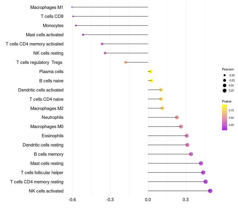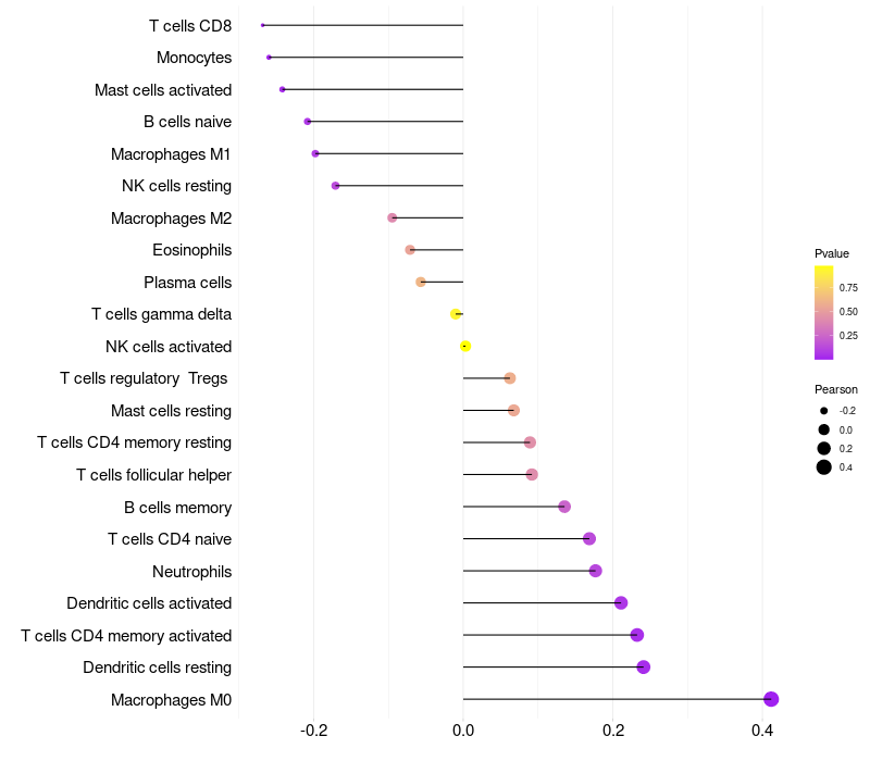Lollipop of SRGAP2 expression and immune infiltrating cell level correlation result in HBV+ Liver cirrhosis samples