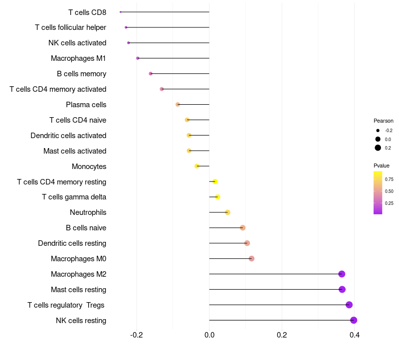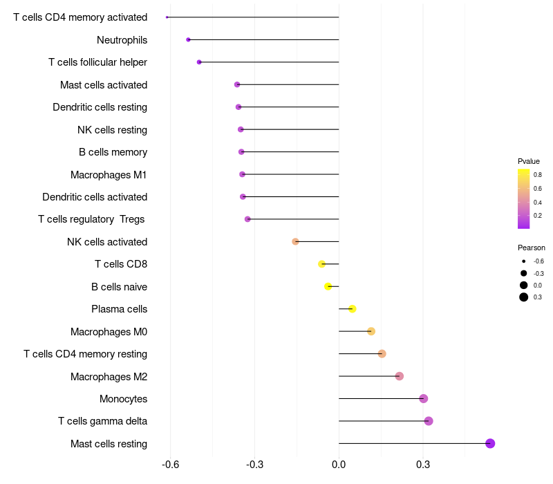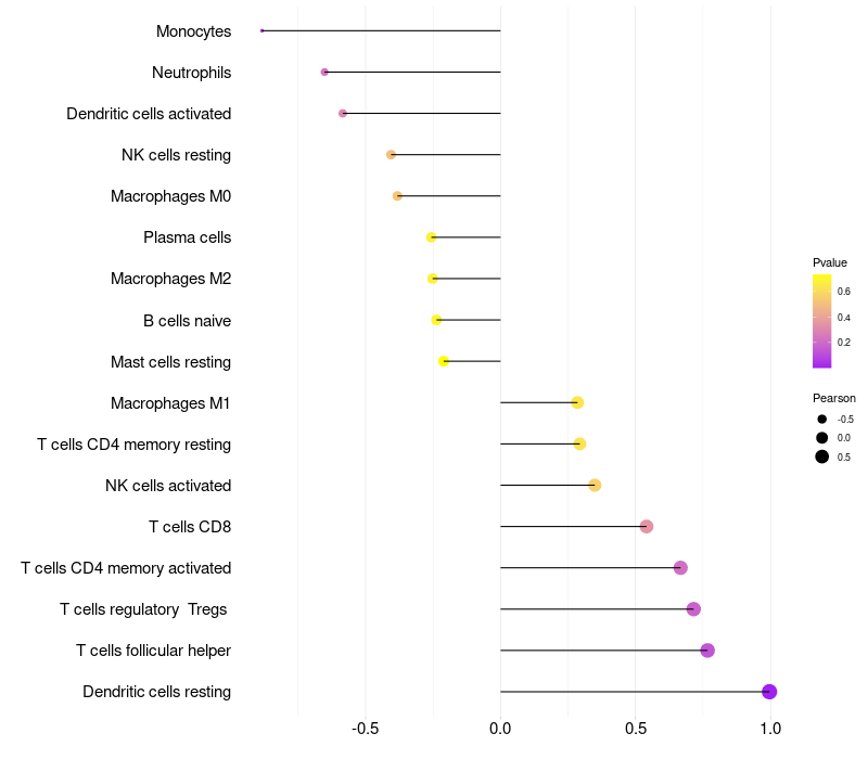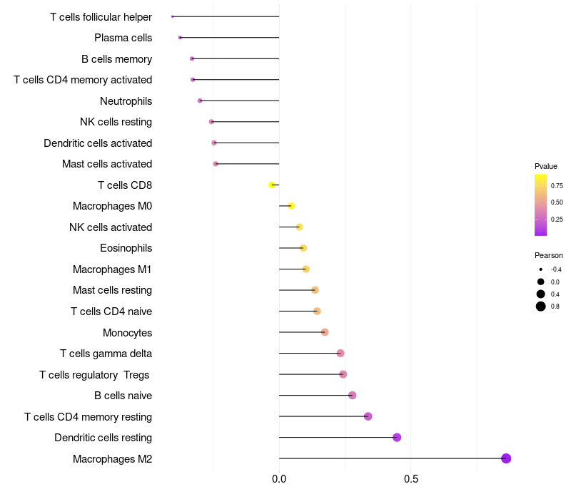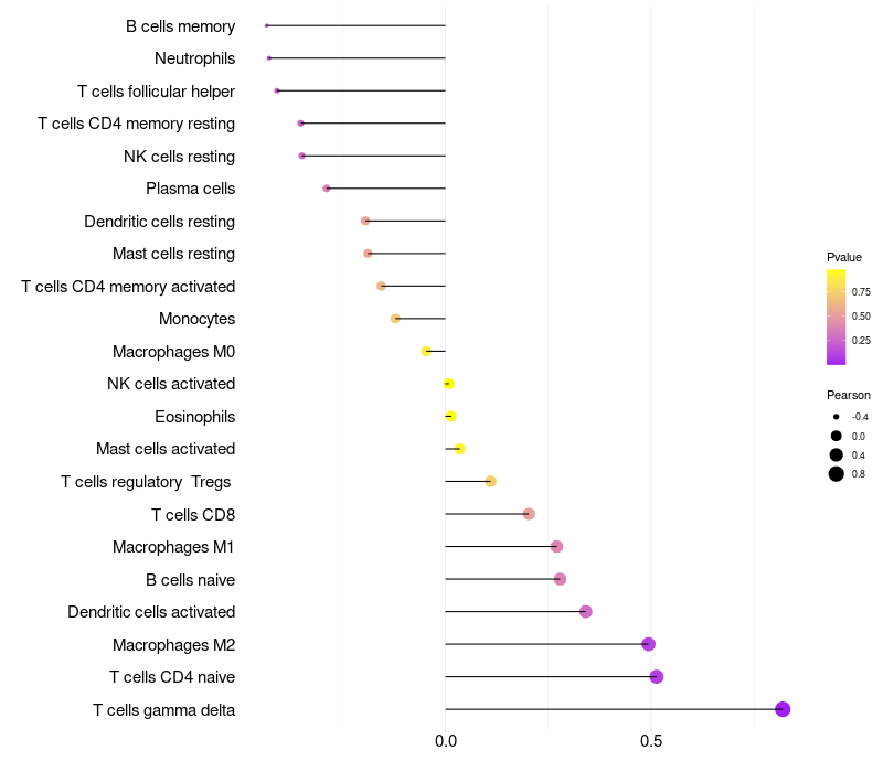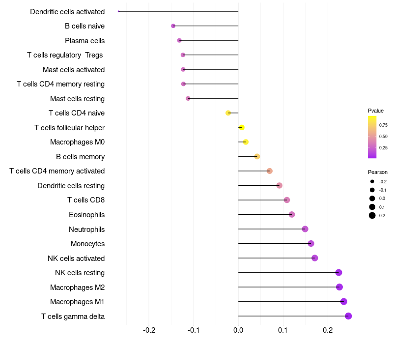 Lollipop of SRL expression and immune infiltrating cell level correlation result in HPV+ samples
