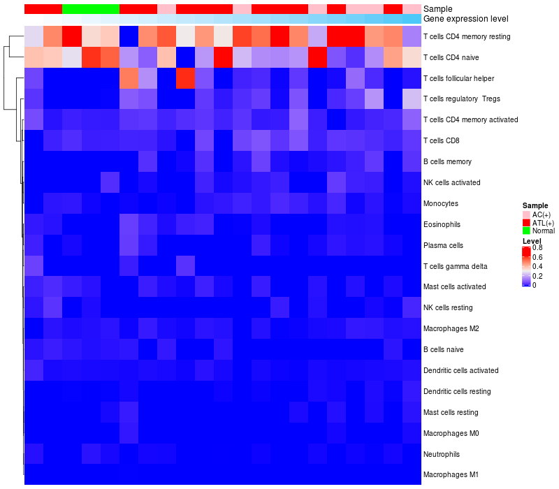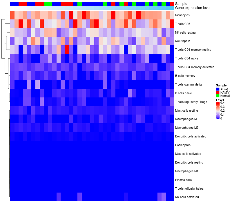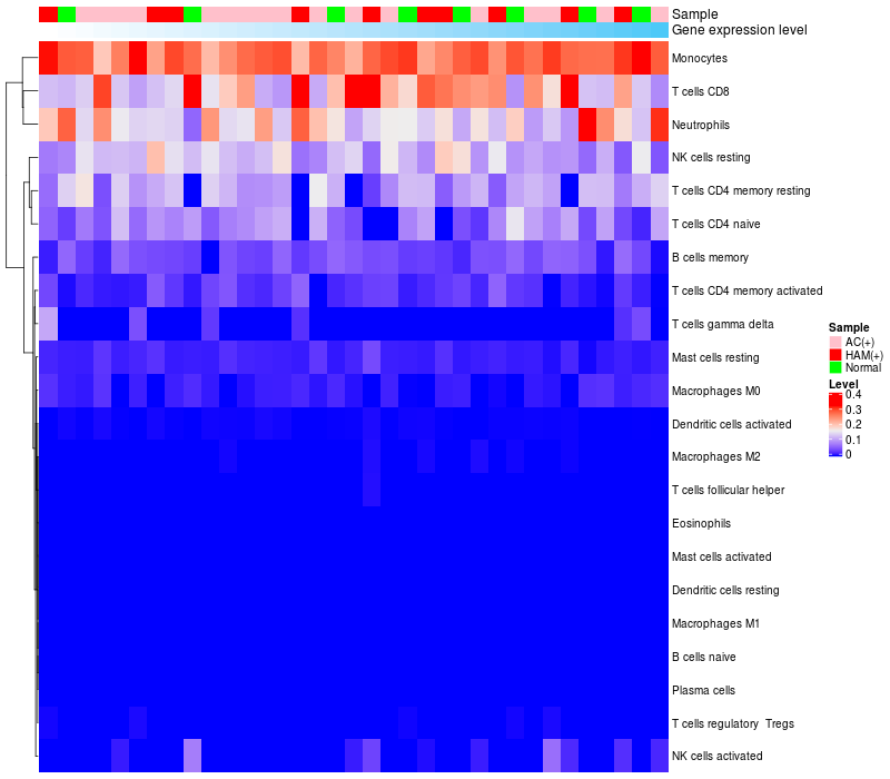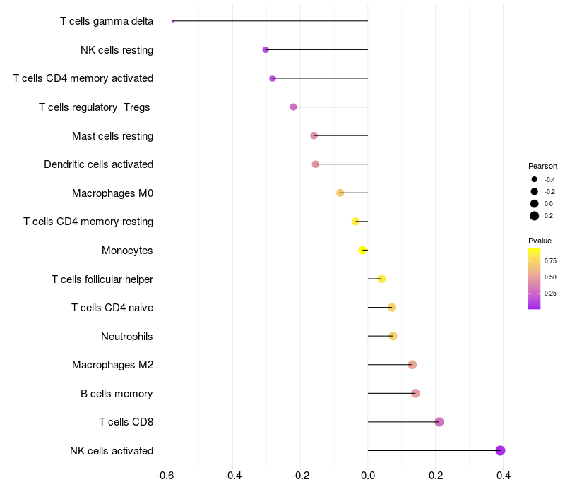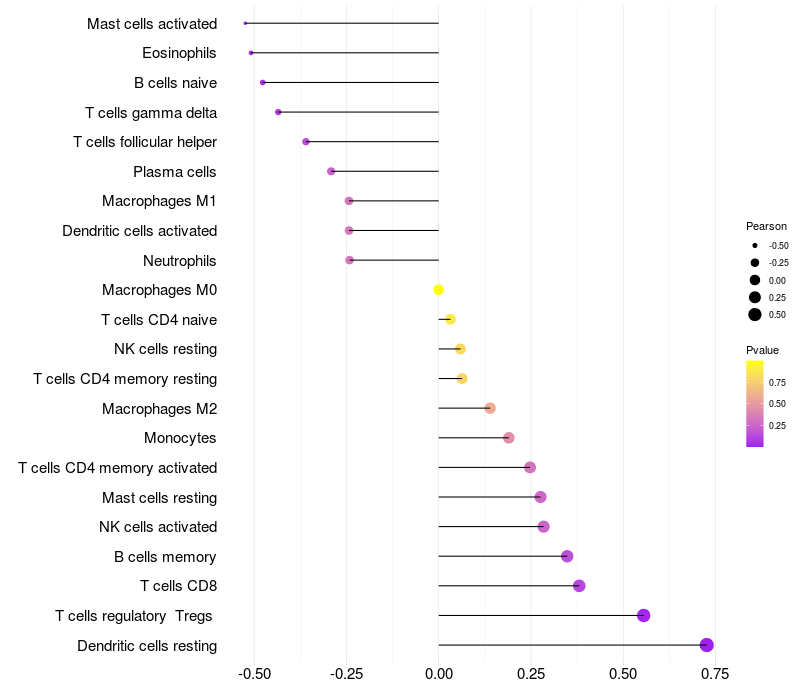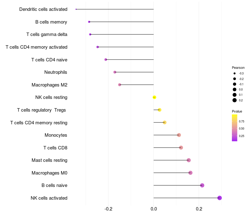Lollipop of SSH1 expression and immune infiltrating cell level correlation result in HTLV1+ samples