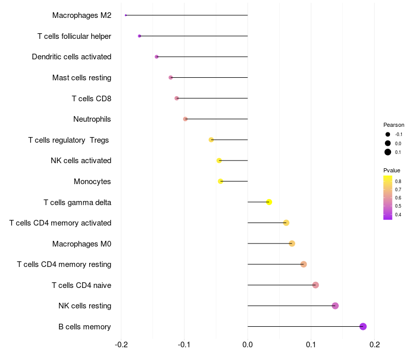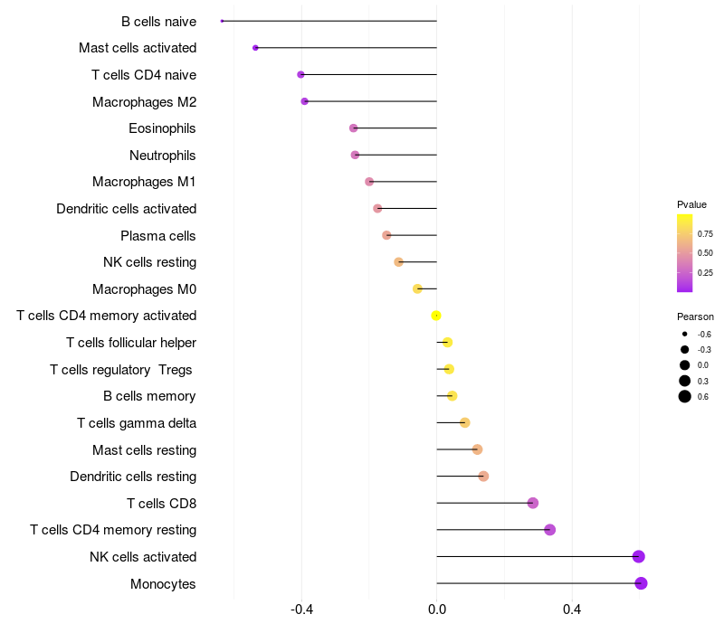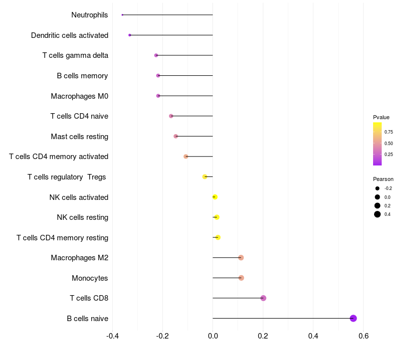 Lollipop of SSR3 expression and immune infiltrating cell level correlation result in HTLV1+ samples