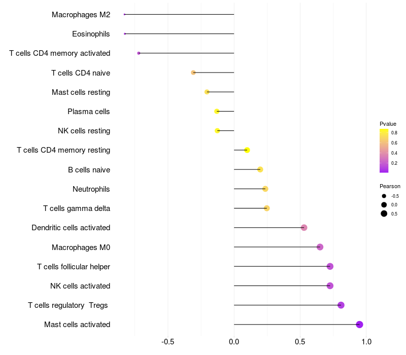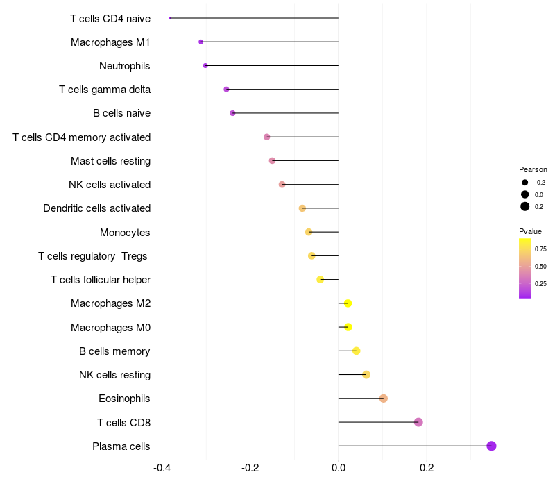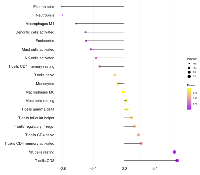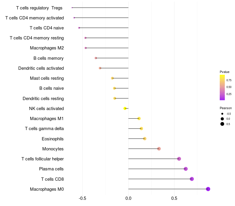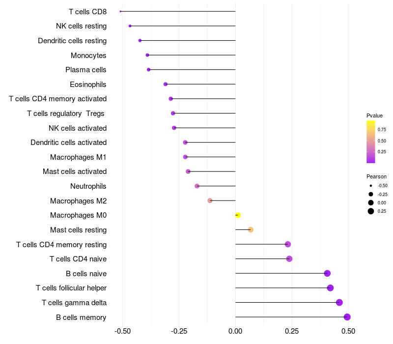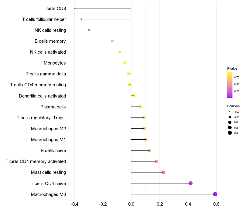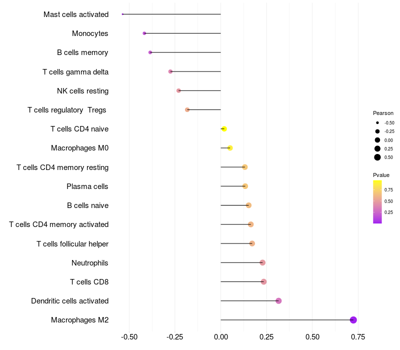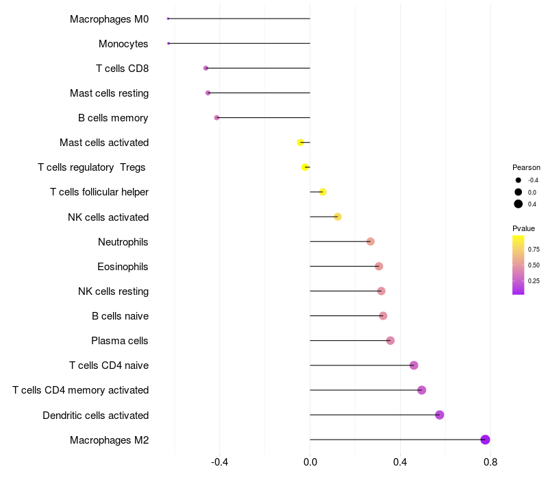 Lollipop of ST6GAL1 expression and immune infiltrating cell level correlation result in EBV+ samples