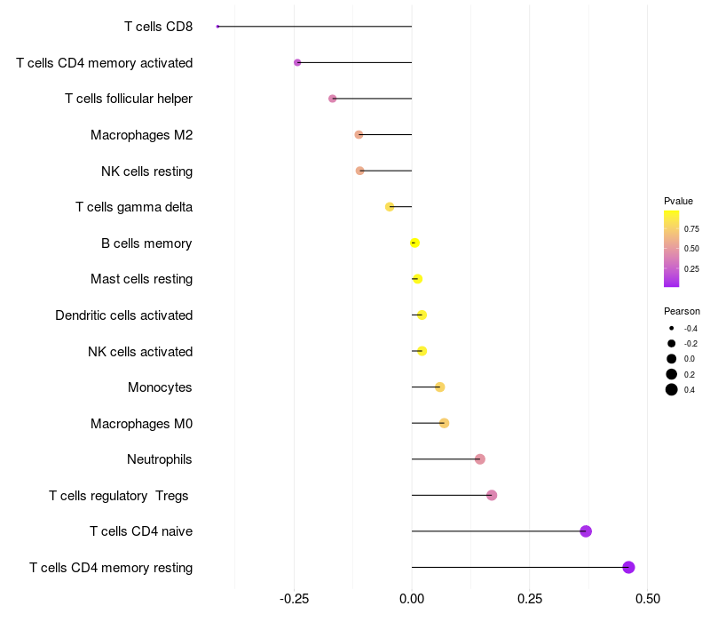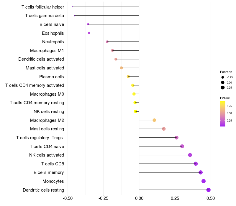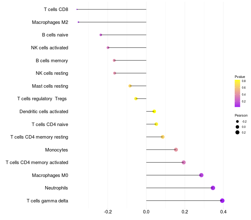 Lollipop of ST6GALNAC5 expression and immune infiltrating cell level correlation result in HTLV1+ samples
