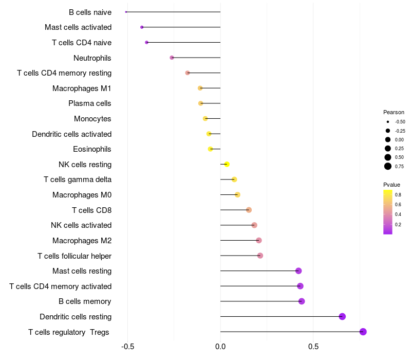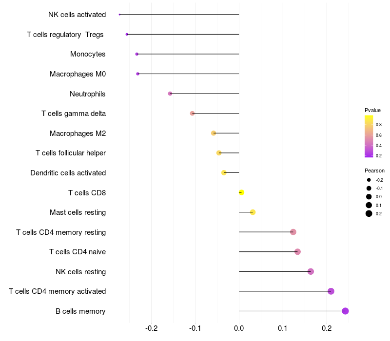 Lollipop of ST8SIA6 expression and immune infiltrating cell level correlation result in HTLV1+ samples