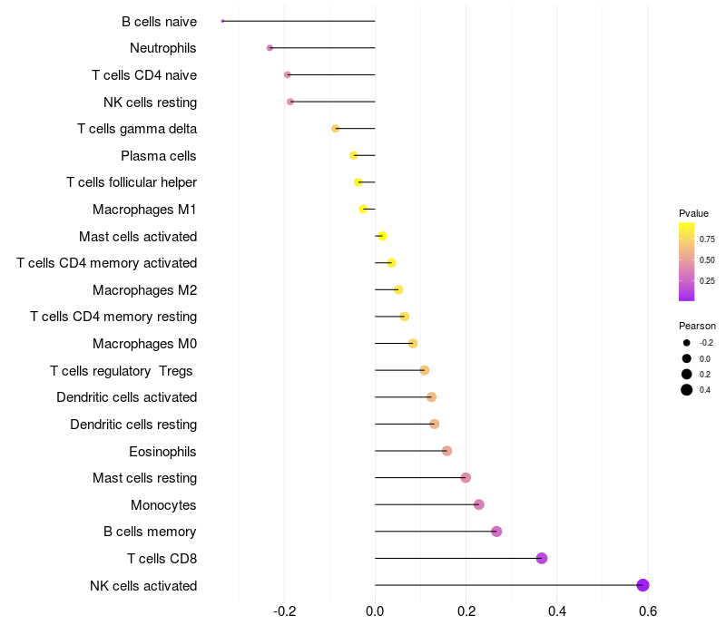 Lollipop of STAB1 expression and immune infiltrating cell level correlation result in HTLV1+ samples