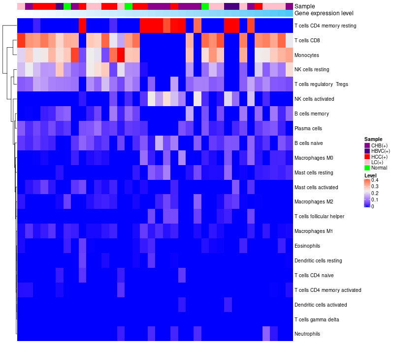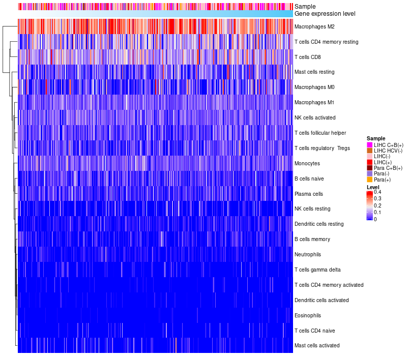 Liver hepatocellular carcinoma HCV (HBV+)(86), Liver hepatocellular carcinoma HCV (HBV-)(19), Liver hepatocellular carcinoma (HBV+)(209), Liver hepatocellular carcinoma (HBV+)(60), Paracancerous HCV (HBV+)(4), Paracancerous (HBV-)(28), Paracancerous (HBV+)(18) |