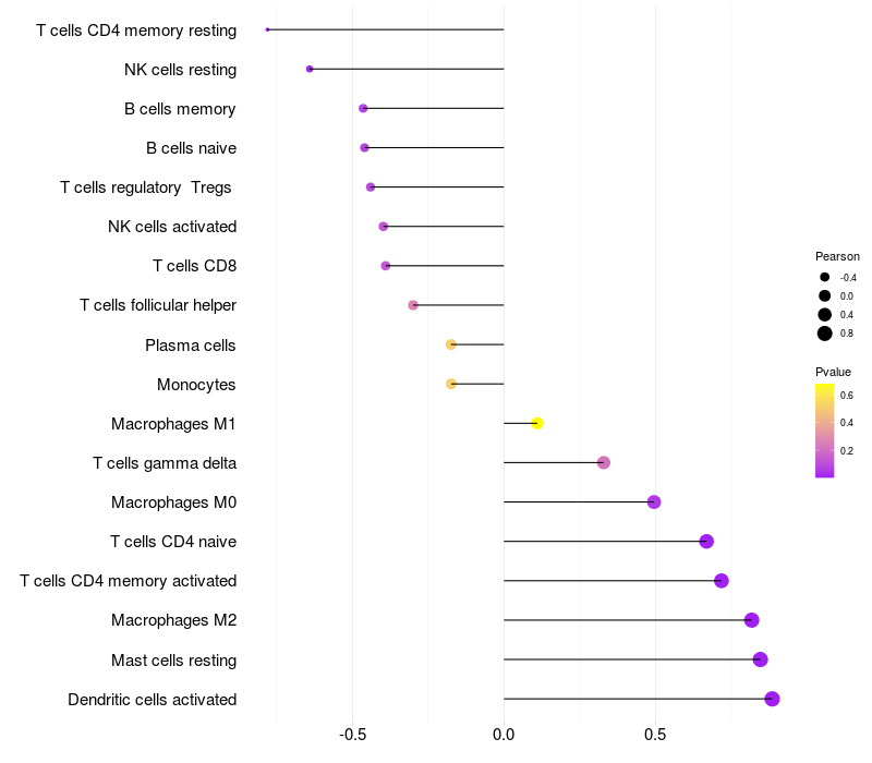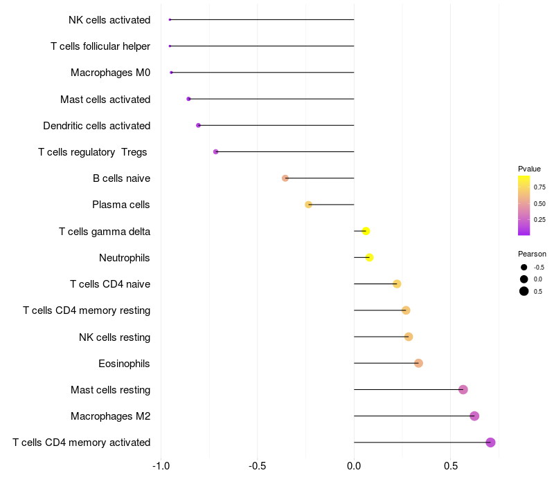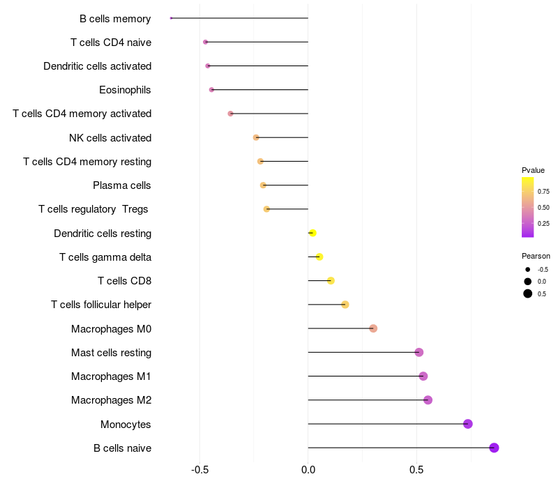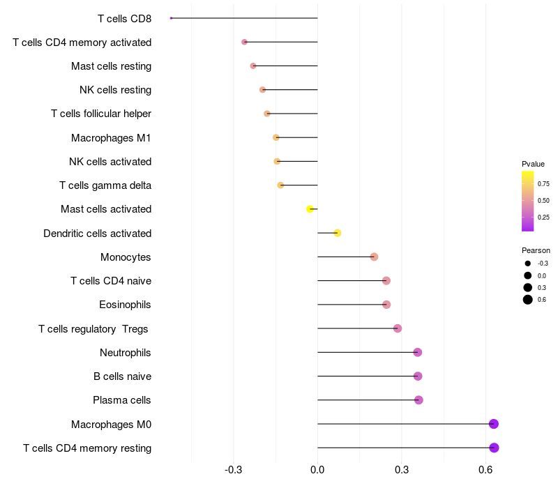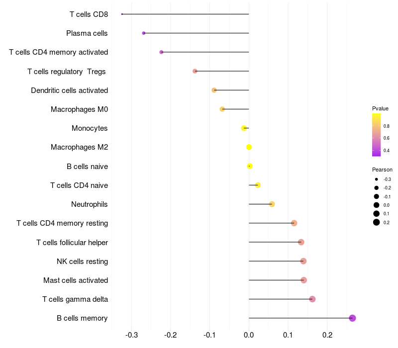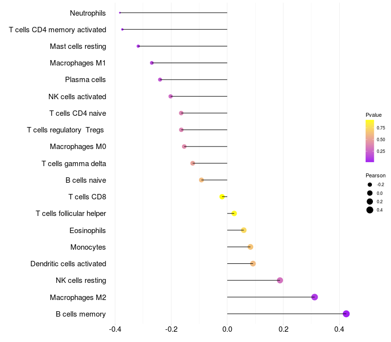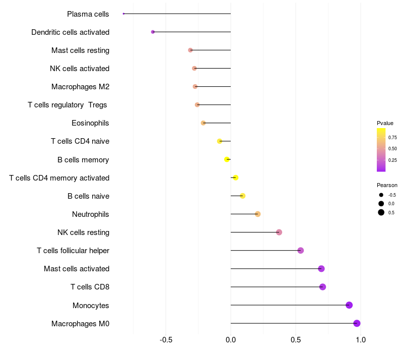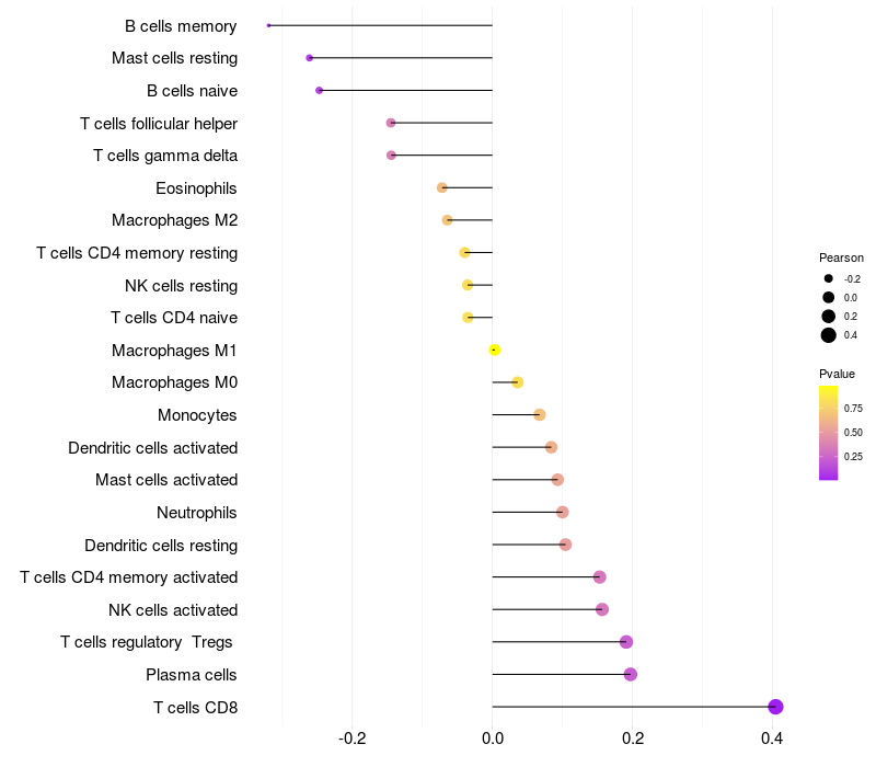 Lollipop of STEAP3 expression and immune infiltrating cell level correlation result in EBV+ samples
