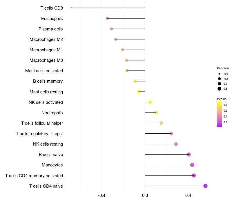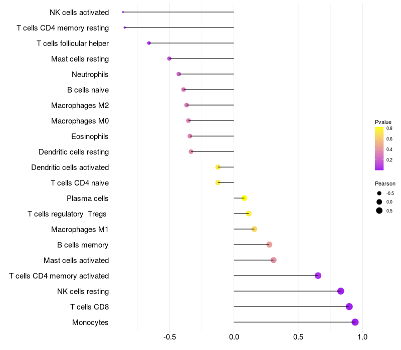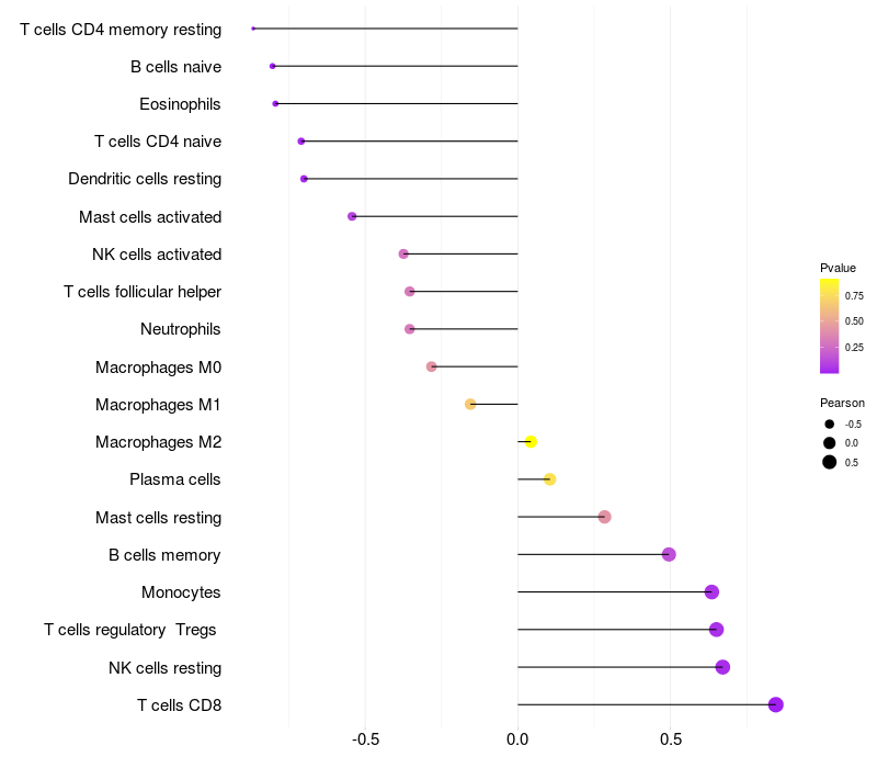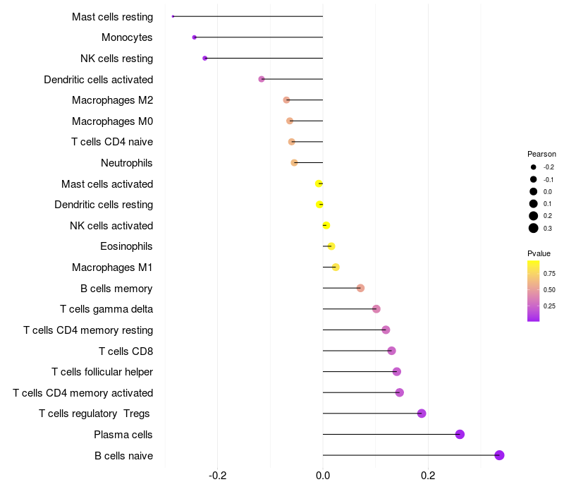 Lollipop of STK10 expression and immune infiltrating cell level correlation result in HBV+ Liver cirrhosis samples