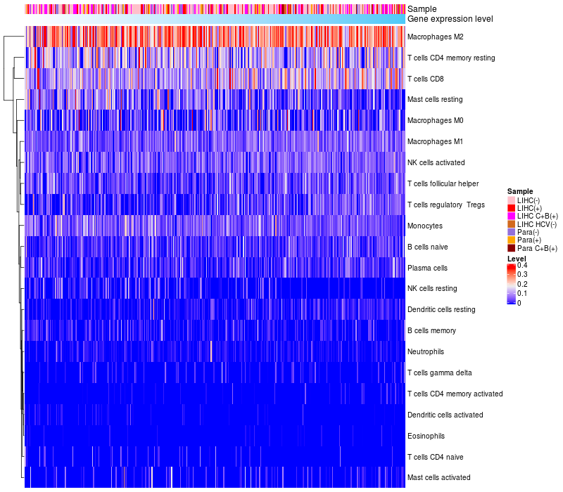 Liver hepatocellular carcinoma HCV (HBV+)(86), Liver hepatocellular carcinoma HCV (HBV-)(19), Liver hepatocellular carcinoma (HBV+)(209), Liver hepatocellular carcinoma (HBV+)(60), Paracancerous HCV (HBV+)(4), Paracancerous (HBV-)(28), Paracancerous (HBV+)(18) |
