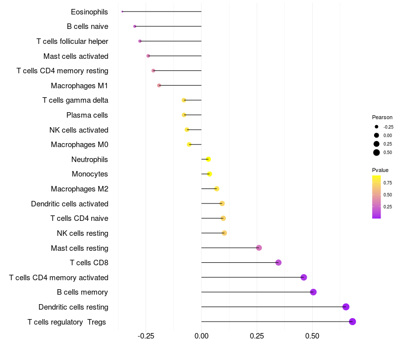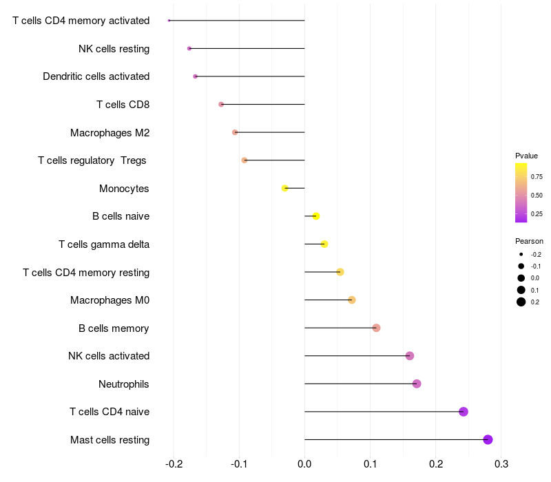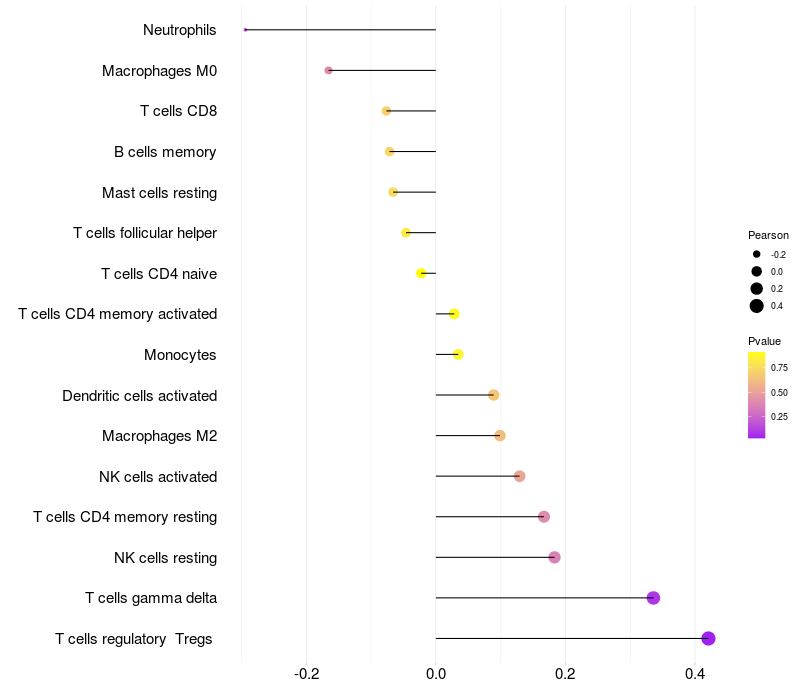 Lollipop of STK31 expression and immune infiltrating cell level correlation result in HTLV1+ samples
