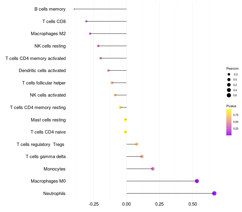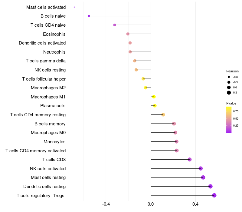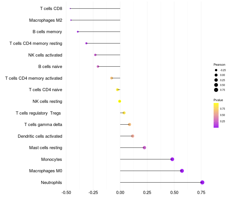Lollipop of STK40 expression and immune infiltrating cell level correlation result in HTLV1+ samples