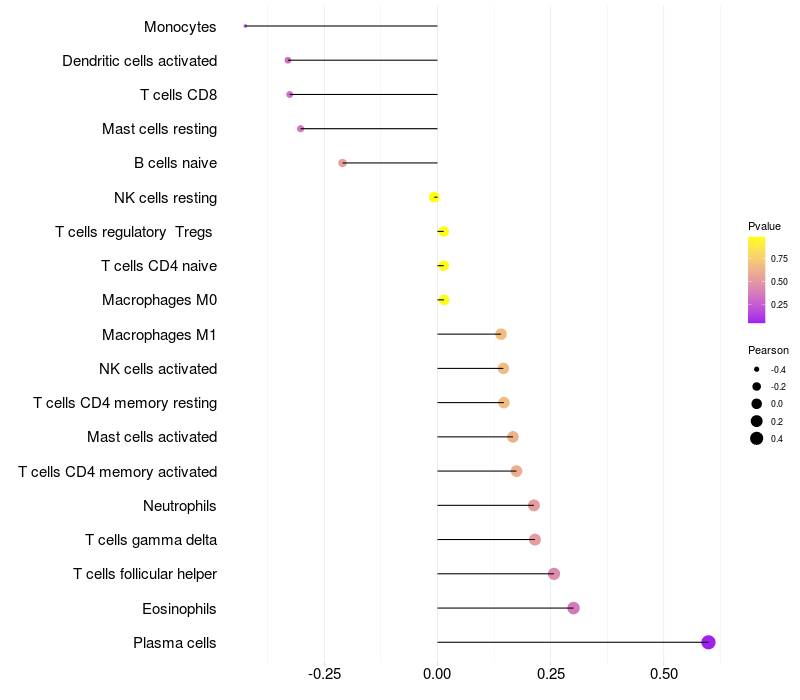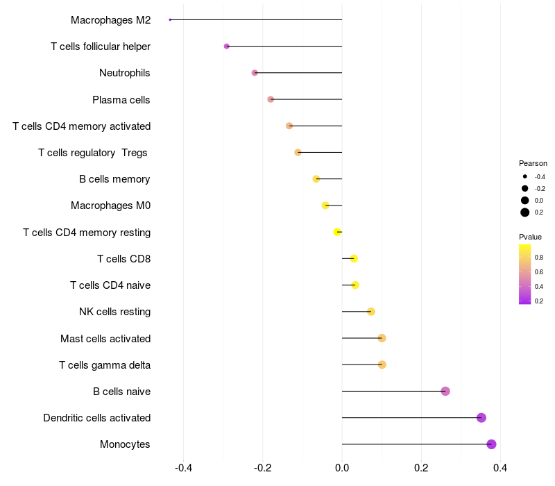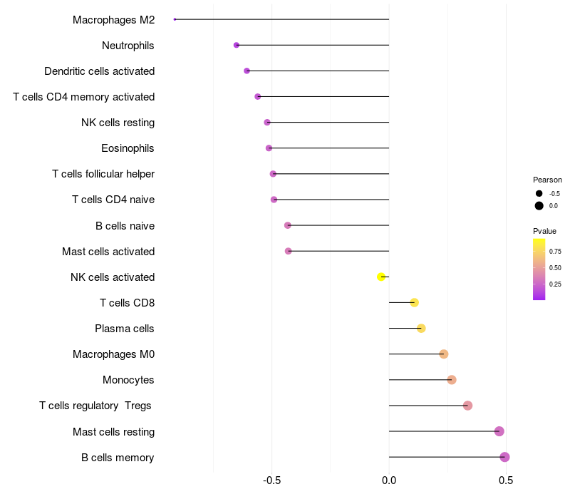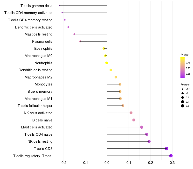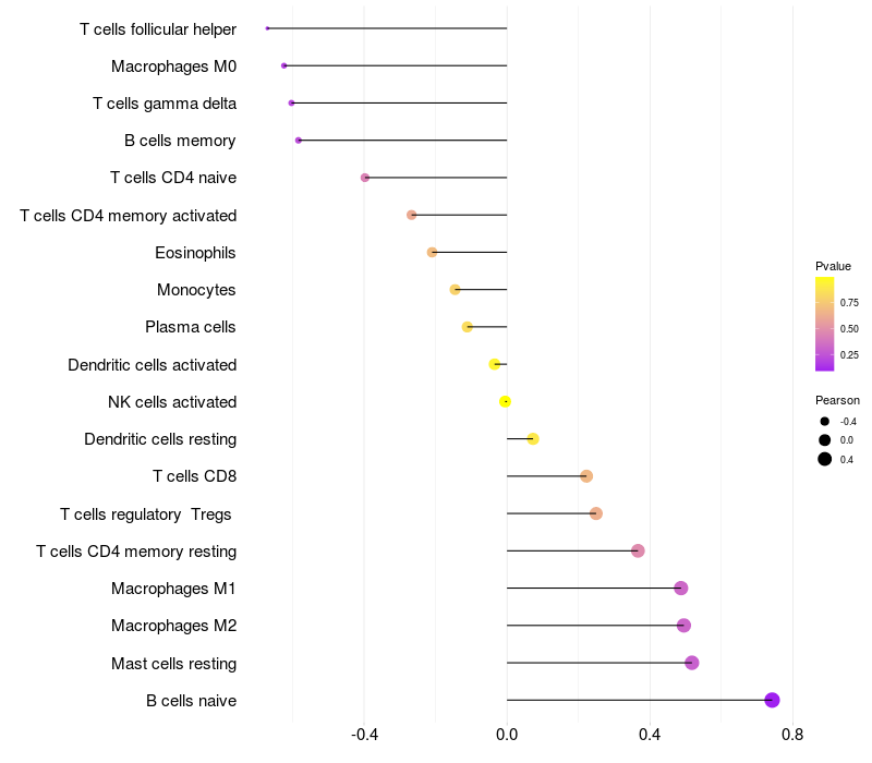 Lollipop of STPG2 expression and immune infiltrating cell level correlation result in EBV+ samples