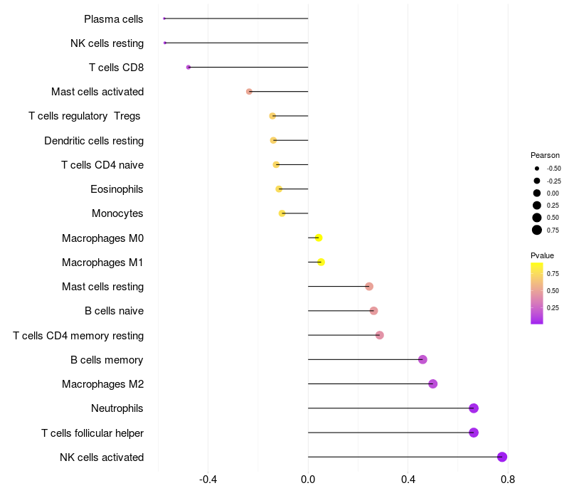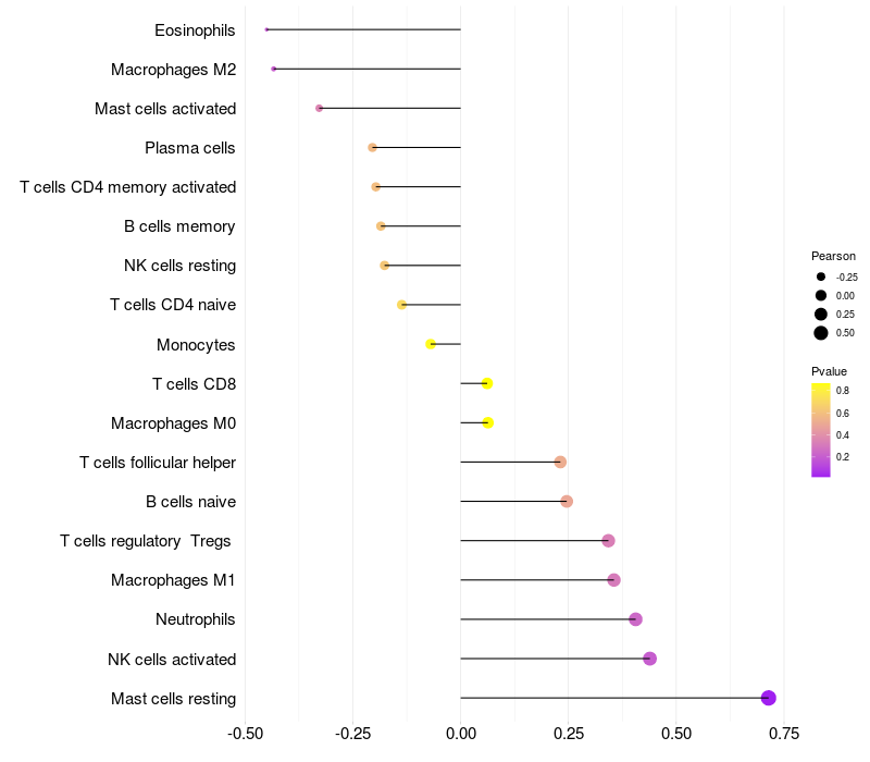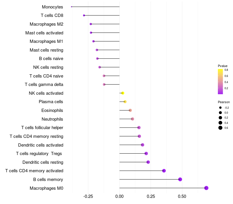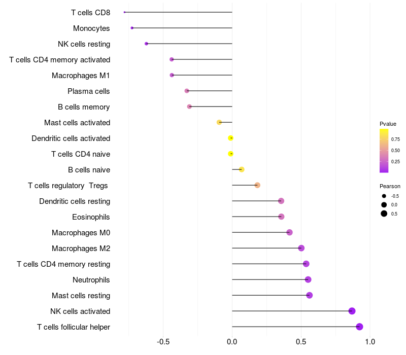 Lollipop of STX6 expression and immune infiltrating cell level correlation result in HBV+ Liver cirrhosis samples