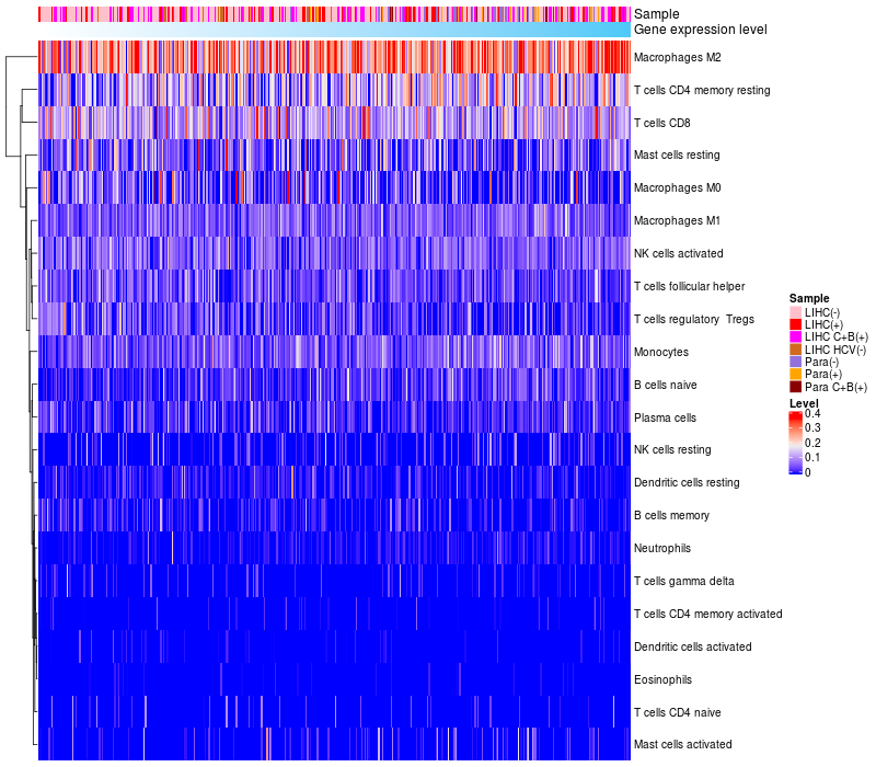 Liver hepatocellular carcinoma HCV (HBV+)(86), Liver hepatocellular carcinoma HCV (HBV-)(19), Liver hepatocellular carcinoma (HBV+)(209), Liver hepatocellular carcinoma (HBV+)(60), Paracancerous HCV (HBV+)(4), Paracancerous (HBV-)(28), Paracancerous (HBV+)(18) |